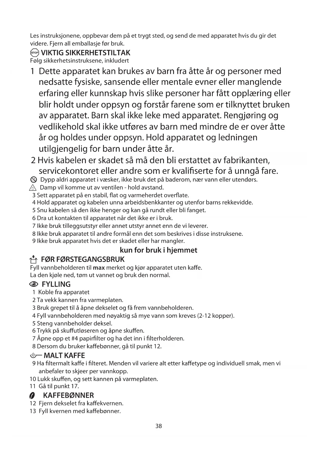 U FØR FØRSTEGANGSBRUK Fyll vannbeholderen til max merket og kjør apparatet uten kaffe.