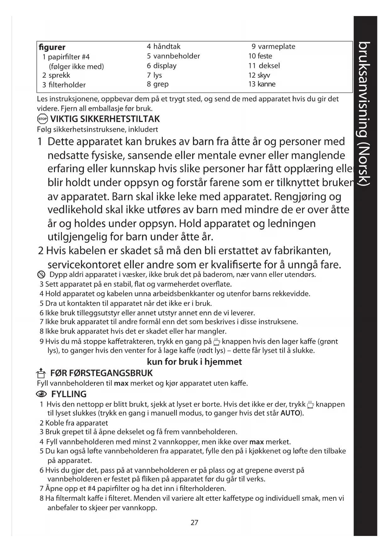 U FØR FØRSTEGANGSBRUK Fyll vannbeholderen til max merket og kjør apparatet uten kaffe.