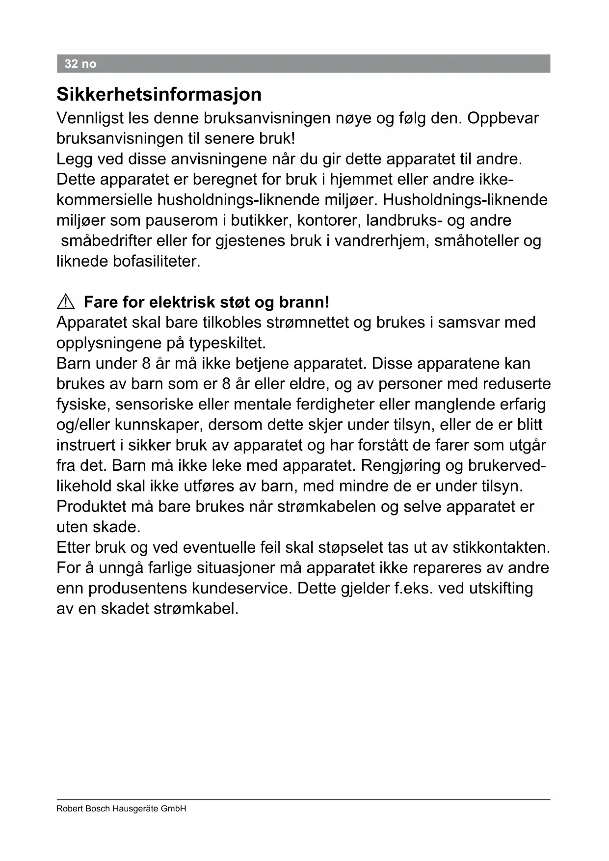 Livsfare! Apparatet må aldri komme i berøring med vann. Fare kan også oppstå når apparatet er slått av, ta derfor alltid ut støpselet etter bruk eller når du legger apparatet fra deg midlertidig. Ytterligere vern gir en jordfeilbryter, opptil 30 mA, som monteres i sikringsskapet. Nærmere opplysninger gis av nærmeste elektro- entreprenør.