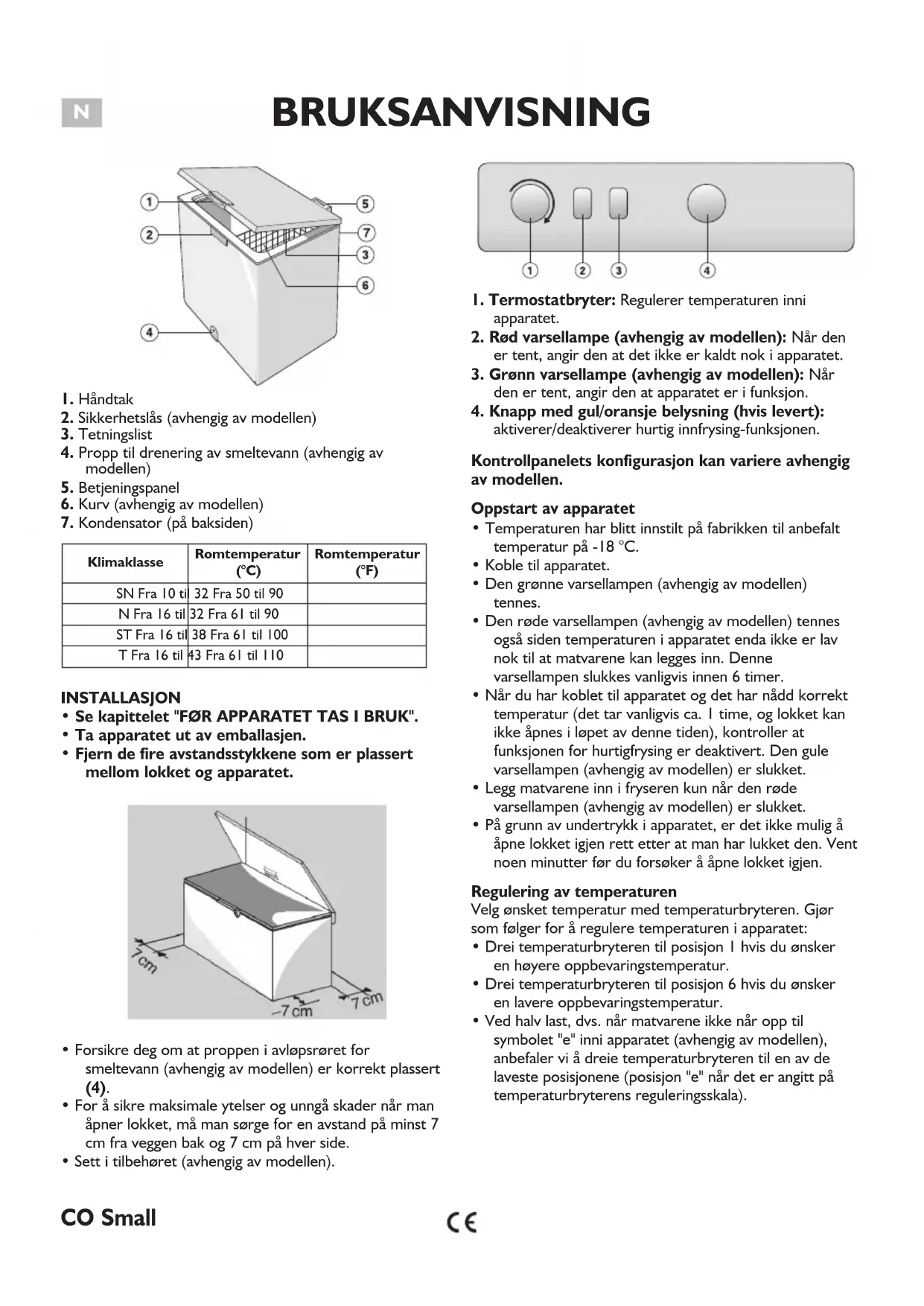 - Ved halv last, dvs. når matvarene ikke når opp til symbolet "e" inni apparatet (avhengig av modellen), anbefaler vi å dreie temperaturbryteren til en av de laveste posisjonene (posisjon "e" når det er angitt på temperaturbryterens reguleringsskala). Klimaklasse Romtemperatur (°C) Romtemperatur (°F) SN Fra 10 til 32 Fra 50 til 90 N Fra 16 til 32 Fra 61 til 90 ST Fra 16 til 38 Fra 61 til 100 T Fra 16 til 43 Fra 61 til 110 CO SmallBRUKSANVISNING