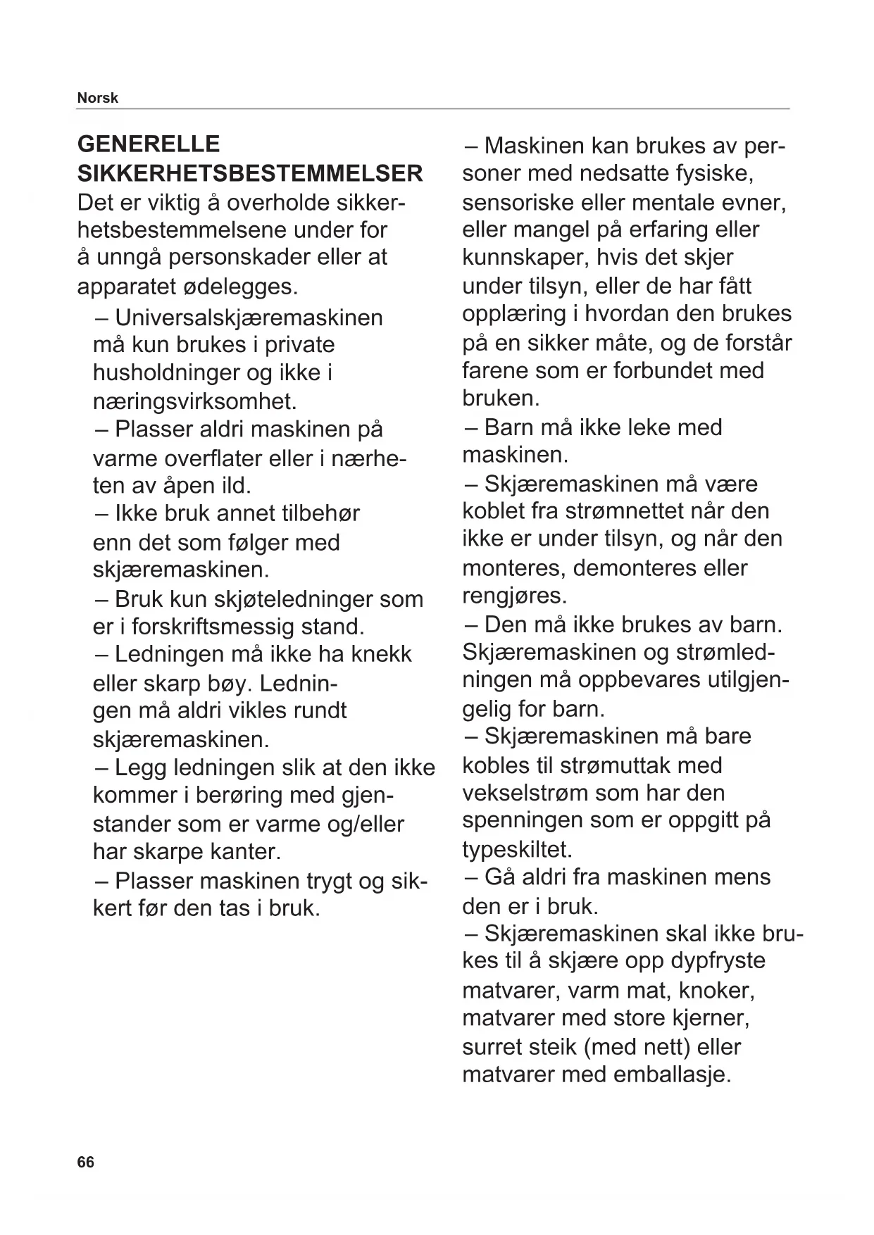 Symbool Verklaring CE-markering: het product is in overeenstemming met de geldende eisen van de Europese Unie. Het product werd na 13 augustus 2005 in de handel gebracht. Het mag niet samen het normale huisvuil worden afgevoerd. Het symbool met het kruis door de afvalcontainer wijst op de noodzaak van een gescheiden inzameling. Geschikt voor contact met levensmiddelen Apparaat van beschermingsklasse II66 Norsk GENERELLE SIKKERHETSBESTEMMELSER Det er viktig å overholde sikker- hetsbestemmelsene under for å unngå personskader eller at apparatet ødelegges. – Universalskjæremaskinen må kun brukes i private husholdninger og ikke i næringsvirksomhet. – Plasser aldri maskinen på varme overater eller i nærhe- ten av åpen ild. – Ikke bruk annet tilbehør enn det som følger med skjæremaskinen. – Bruk kun skjøteledninger som er i forskriftsmessig stand. – Ledningen må ikke ha knekk eller skarp bøy. Lednin- gen må aldri vikles rundt skjæremaskinen. – Legg ledningen slik at den ikke kommer i berøring med gjen- stander som er varme og/eller har skarpe kanter. – Plasser maskinen trygt og sik- kert før den tas i bruk. – Maskinen kan brukes av per- soner med nedsatte fysiske, sensoriske eller mentale evner, eller mangel på erfaring eller kunnskaper, hvis det skjer under tilsyn, eller de har fått opplæring i hvordan den brukes på en sikker måte, og de forstår farene som er forbundet med bruken. – Barn må ikke leke med maskinen. – Skjæremaskinen må være koblet fra strømnettet når den ikke er under tilsyn, og når den monteres, demonteres eller rengjøres. – Den må ikke brukes av barn. Skjæremaskinen og strømled- ningen må oppbevares utilgjen- gelig for barn. – Skjæremaskinen må bare kobles til strømuttak med vekselstrøm som har den spenningen som er oppgitt på typeskiltet. – Gå aldri fra maskinen mens den er i bruk. – Skjæremaskinen skal ikke bru- kes til å skjære opp dypfryste matvarer, varm mat, knoker, matvarer med store kjerner, surret steik (med nett) eller matvarer med emballasje.67 – La aldri maskinen gå uavbrutt i mer enn 5 minutter. – Hvis du bruker pacemaker eller har implantert hjertestarter, må du holde god avstand til magneter. – Pass på at magnetiske databærere (kredittkort, min- nebrikker osv.) og elektroniske apparater (mobiler, PC-er, monitorer osv.) ikke kommer i nærheten av sterke magnetfelt. Fare for elektrisk støt – Ta alltid støpselet ut av stik- kontakten ved driftsproblemer, før maskinen skal rengjøres, og når den ikke er i bruk. Trekk alltid ut selve støpselet uten å dra i ledningen. – Maskinen må aldri dyppes i vann. Den må aldri utsettes for regn eller annen fuktighet. Hvis skjæremaskinen likevel skulle falle ned i vann, må du først ta støpselet ut av stikkontakten, og deretter skjæremaskinen opp av vannet. Maskinen må i slike tilfeller kontrolleres av et autorisert serviceverksted før den tas i bruk igjen. – Ikke bruk skjæremaskinen når du er fuktig på hendene. Ikke bruk skjæremaskinen hvis den er fuktig eller vått, eller hvis du står på et fuktig underlag. Mas- kinen må ikke brukes utendørs. – Slutt å bruke skjæremaskinen umiddelbart hvis en del er øde- lagt eller skadet, og ta kontakt med ritter kundeservice. – For å unngå farlige situasjoner skal en skadet ledning skiftes av produsenten, av kunde- service eller av andre kvali- serte personer. Fare for personskader – Denne skjæremaskinen må ikke brukes uten skyvebrett og sikkerhetsholder, med mindre matvaren er så stor, eller har en slik form, at bruken ikke er mulig. – Maskinen må være avslått og frakoblet strømnettet før det foretas skifte av tilbehør eller bevegelige deler. – Rundkniven er svært skarp. – Pass på at du aldri kommer i berøring med rundkniven under arbeidet! – Slå av skjæremaskinen før den skal gjøres ren, ta støpselet ut av stikkontakten og drei juster- ingsknappen for skivetykkelse i «0»-stilling. – Rundkniven fortsetter å gå en kort stund etter at maskinen er slått av. Norsk68 Norsk Fold ut illustrasjonene foran og bak i heftet. Les bruksanvisningen nøye før du tar maskinen i bruk. Oppbevar bruksanvisningen på et trygt sted. Den hører til maskinen, og skal følge med til eventuell ny bruker. Du nner også den aktuelle bruksanvisningen på www.ritterwerk.de. BRUKSOMRÅDE Universalskjæremaskinen skal brukes til oppskjæring av matva- rer i private husholdninger. Universalskjæremaskinen er egnet for kontakt med matvarer. Ikke forskriftsmessig bruk eller feilbetjening kan føre til alvorlige personskader og/eller ødelegge skjæremaskinen. Alle garanti og ansvarskrav vil da bortfalle.