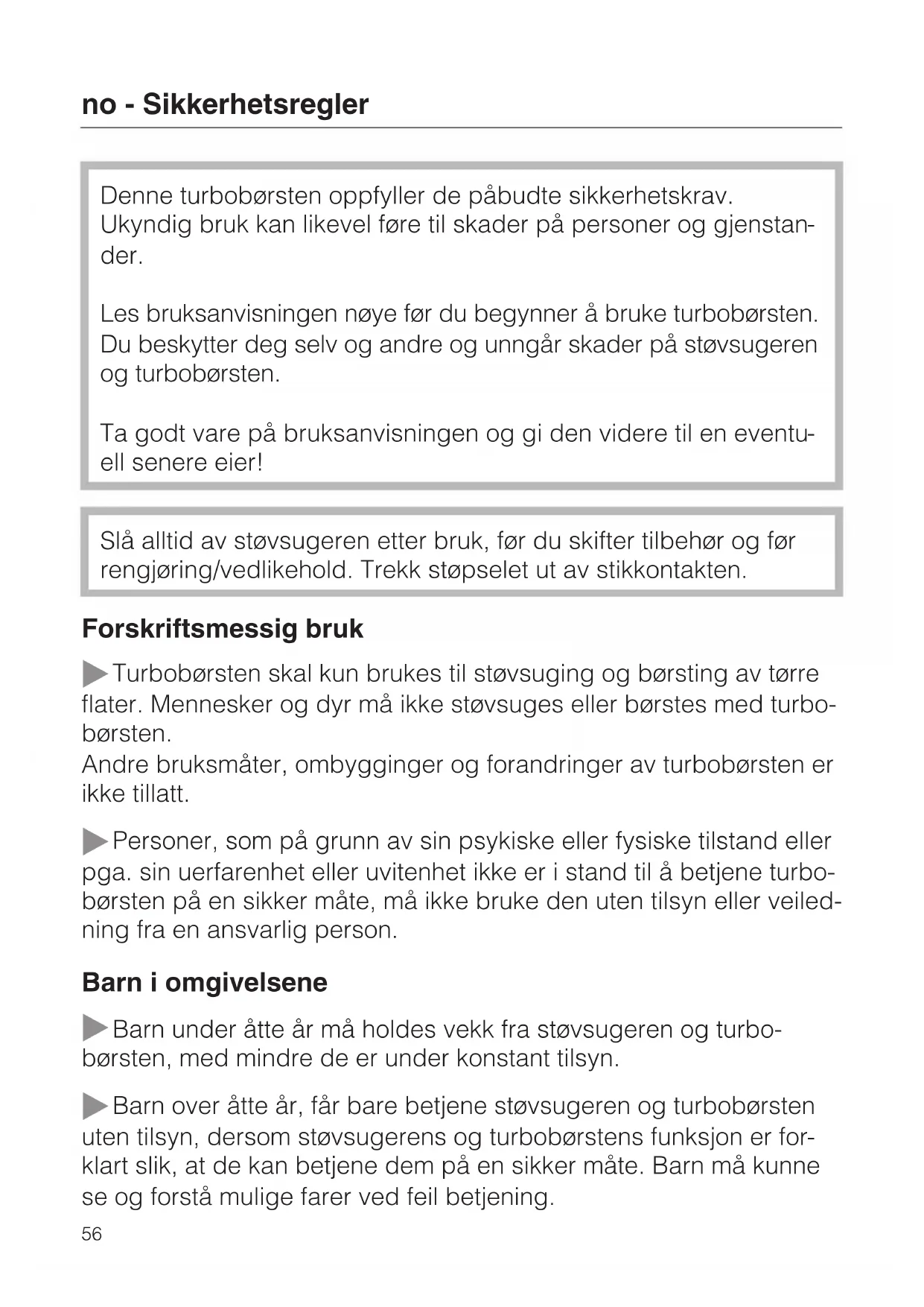 Turbobørsten skal kun brukes til støvsuging og børsting av tørre