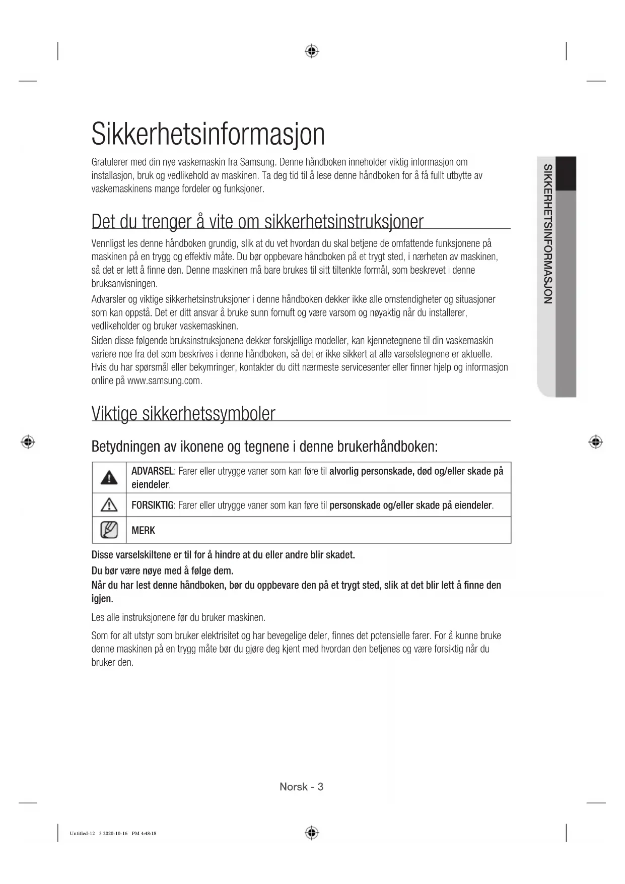 Gratulerer med din nye vaskemaskin fra Samsung. Denne håndboken inneholder viktig informasjon om