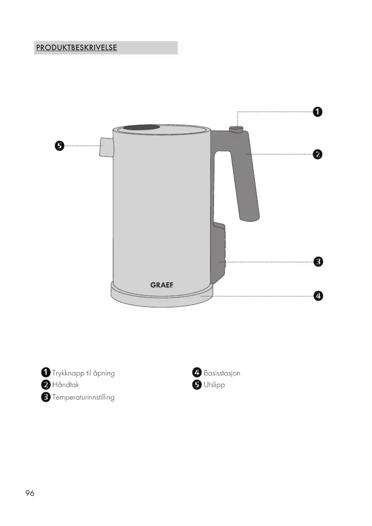Denne bruksanvisningen er en del av vannkokeren (heretter kalt apparatet) og gir deg viktig informasjon om bruk, sikkerhet, tiltenkt bruk og vedlikehold av apparatet. Bruksanvisningen skal alltid være tilgjengelig ved apparatet. Den skal leses og anvendes av alle personer som har å gjøre med: ● Igangsetting, ● Betjening, ● Feilutbedring og/eller: ● Rengjøring Oppbevar bruksanvisningen og gi videre sammen med apparatet til neste eier. Denne bruksanvisningen kan ikke ta hensyn til ethvert forestillbart aspekt. For ytterligere informas- jon eller ved problemer som ikke behandles eller ikke behandles utførlig nok i denne anvisnin- gen, henvend deg til Graefs kundeservice eller til din faghandel. ADVARSLER I den aktuelle bruksanvisningen blir følgende advarsler og signalord brukt: ADVARSEL Dette henviser til en mulig farlig situasjon. Dersom anvisningen ikke følges, kan det oppstå alvorlige personskader eller til og med medføre døden. FORSIKTIG Dette henviser til en mulig farlig situasjon. Hvis denne anvisningen ikke følges, kan det oppstå materielle skader. VIKTIG! Dette henviser til brukertips og annen spesielt viktig informasjon!98 GENERELLE SIKKERHETSINSTRUKSER Dette apparatet oppfyller de foreskrevne sikkerhetsbestemmelsene. Us- akkyndig bruk kan likevel føre til personskader og materielle skader. Overhold følgende sikkerhetsanvisninger for en sikker omgang med ap- paratet: ● Kontroller apparatet for ytre synlige skader på hus, strømledning og -støpsel før bruk. Ta aldri et skadet apparat i bruk. ● Reparasjoner må bare utføres av en fagperson eller av Graefs kunde- service. Feilaktige reparasjoner kan utsette brukeren for store farer. I tillegg ugyldiggjøres krav på garantiytelser. ● Defekte komponenter skal kun skiftes ut med originale reservedeler. Kun med disse delene kan det garanteres at sikkerhetskravene oppfylles. ● Denne enheten må ikke brukes av barn. Apparatet og apparatets strømledning må holdes unna barn. ● Barn skal holdes under tilsyn for å sikre at de ikke leker med apparatet. ● Denne enheten kan også brukes av personer med reduserte fysiske, sensoriske eller mentale evner eller med mangel på erfaring og/eller kunnskap, hvis de er under oppsyn eller har blitt instruert i sikker bruk av enheten og har forstått farene som oppstår ved det.Apparatet er ikke beregnet til bruk med et eksternt tidsur eller en separat fjernkontroll. ● Apparatet er ikke beregnet til bruk med et eksternt tidsur eller en sepa- rat fjernkontroll. ● Strømledningen skal alltid trekkes ut fra stikkontakten etter støpselet, ikke etter strømledningen. ● Ikke bruk apparatet hvis strømledningen eller støpselet er skadet. ● Forhindre at det kommer væske på støpselet. ● Hvis tilkoblingsledningen er skadet, skal den, for å unngå farer, kun skif- tes ut av produsenten, kundeservice eller en lignende kvalifisert person. ● Huset på apparatet må ikke under noen omstendigheter åpnes. Hvis spenningsførende tilkoblinger berøres og den elektriske og mekaniske oppbygningen forandres, er det fare for elektrisk støt. ● Berør aldri deler som står under spenning. Dette kan føre til elektrisk støt og til og med døden.99