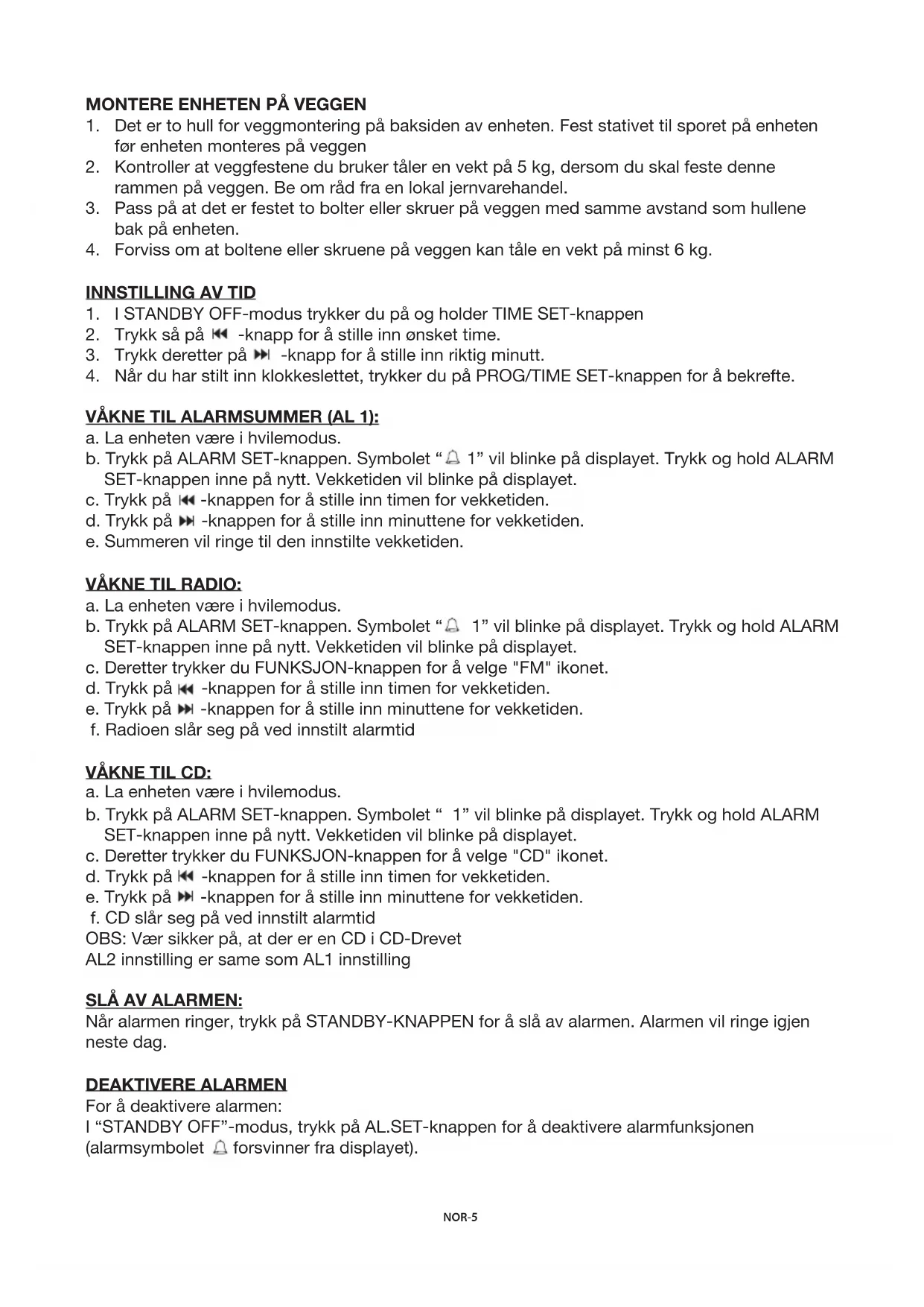 VÅKNE TIL ALARMSUMMER (AL 1): a. La enheten være i hvilemodus. b. Trykk på ALARM SET-knappen. Symbolet “ 1” vil blinke på displayet. Trykk og hold ALARM SET-knappen inne på nytt. Vekketiden vil blinke på displayet. c. Trykk på -knappen for å stille inn timen for vekketiden. d. Trykk på -knappen for å stille inn minuttene for vekketiden. e. Summeren vil ringe til den innstilte vekketiden. VÅKNE TIL RADIO: a. La enheten være i hvilemodus. b. Trykk på ALARM SET-knappen. Symbolet “ 1” vil blinke på displayet. Trykk og hold ALARM SET-knappen inne på nytt. Vekketiden vil blinke på displayet. c. Deretter trykker du FUNKSJON-knappen for å velge "FM" ikonet. d. Trykk på -knappen for å stille inn timen for vekketiden. e. Trykk på -knappen for å stille inn minuttene for vekketiden. f. Radioen slår seg på ved innstilt alarmtid VÅKNE TIL CD: a. La enheten være i hvilemodus. b. Trykk på ALARM SET-knappen. Symbolet “ 1” vil blinke på displayet. Trykk og hold ALARM SET-knappen inne på nytt. Vekketiden vil blinke på displayet. c. Deretter trykker du FUNKSJON-knappen for å velge "CD" ikonet. d. Trykk på -knappen for å stille inn timen for vekketiden. e. Trykk på -knappen for å stille inn minuttene for vekketiden. f. CD slår seg på ved innstilt alarmtid OBS: Vær sikker på, at der er en CD i CD-Drevet AL2 innstilling er same som AL1 innstilling SLÅ AV ALARMEN: Når alarmen ringer, trykk på STANDBY-KNAPPEN for å slå av alarmen. Alarmen vil ringe igjen neste dag. DEAKTIVERE ALARMEN For å deaktivere alarmen: I “STANDBY OFF”-modus, trykk på AL.SET-knappen for å deaktivere alarmfunksjonen (alarmsymbolet forsvinner fra displayet).