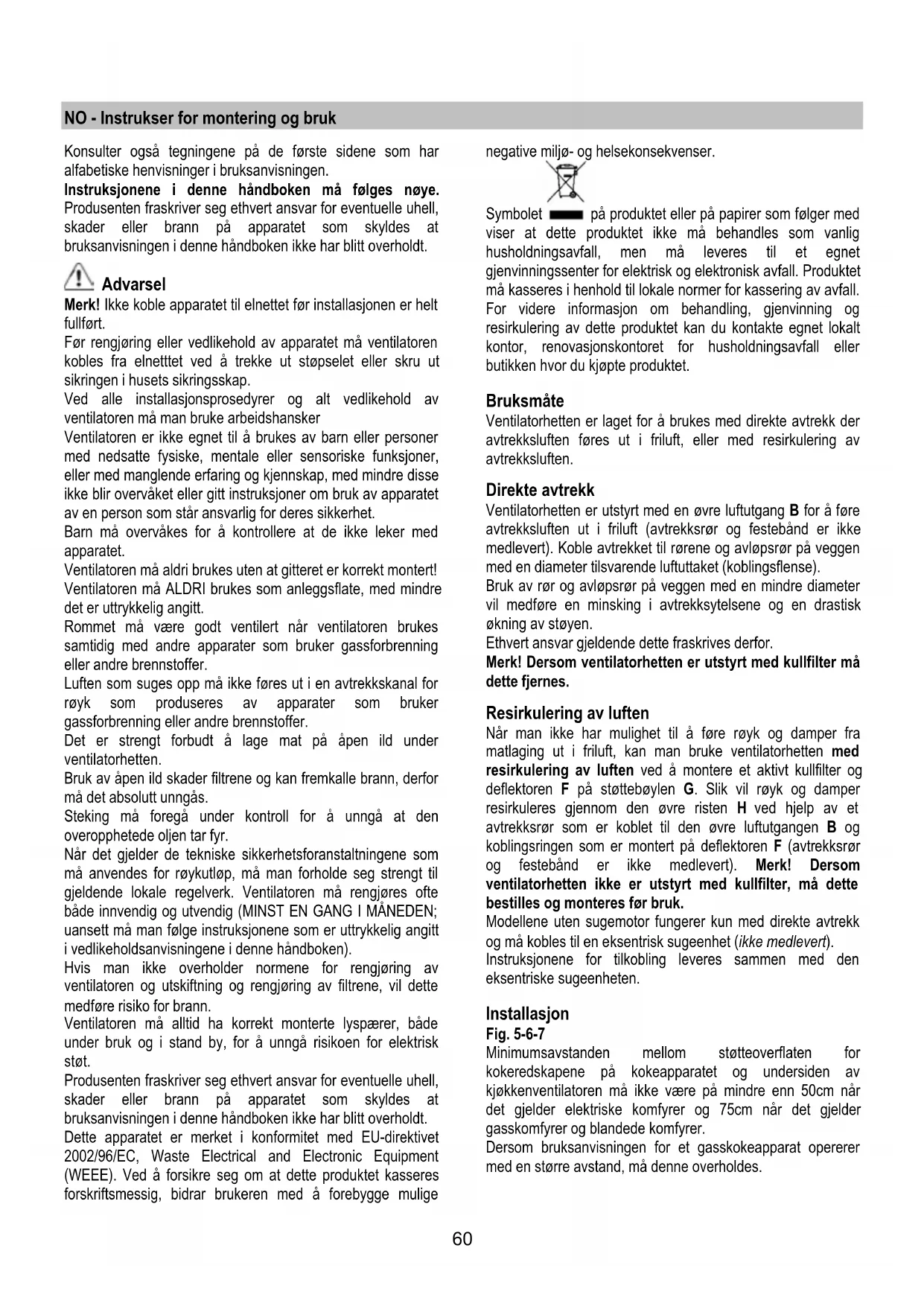 Merk! Ikke koble apparatet til elnettet før installasjonen er helt
