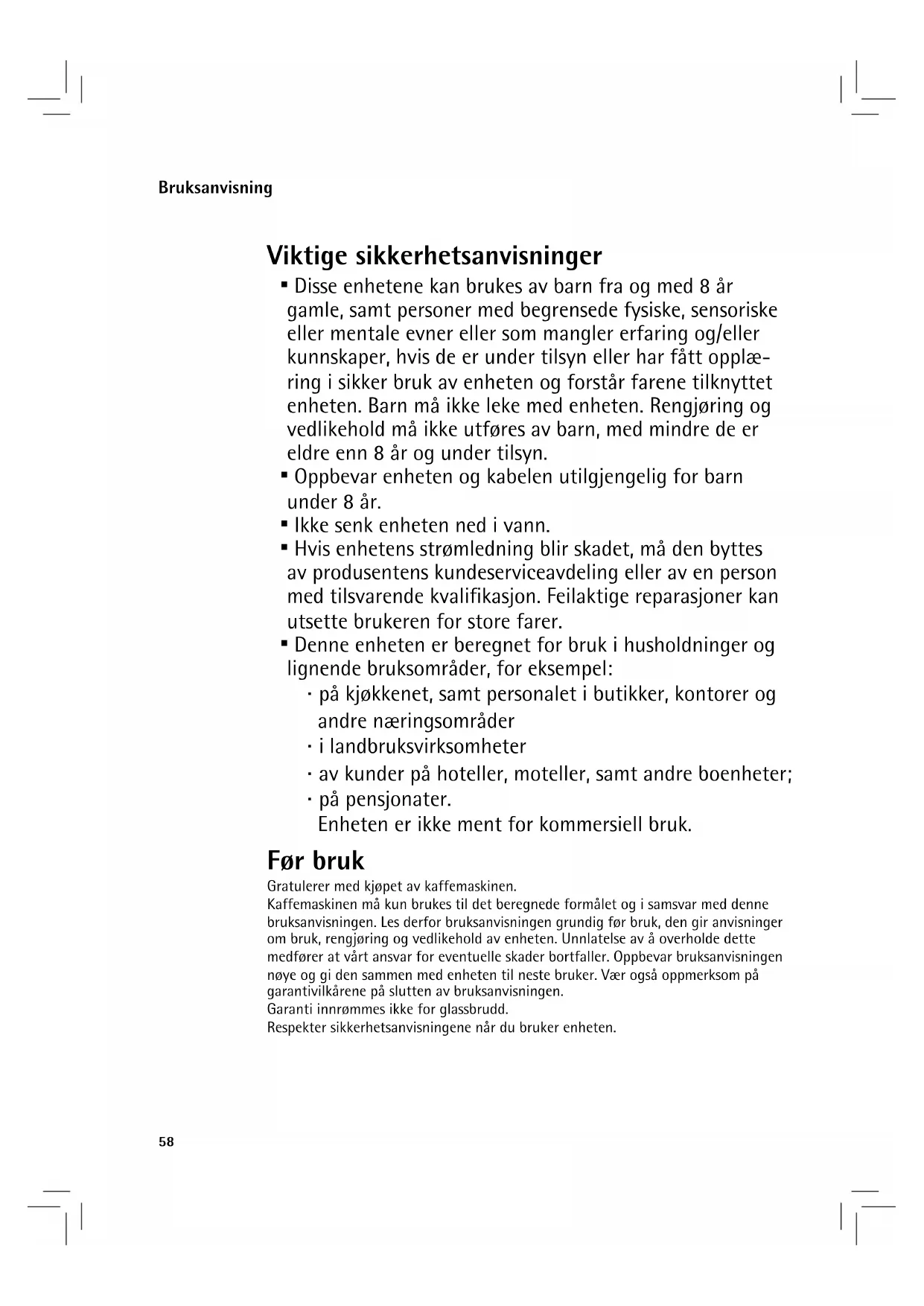 - Denne enheten er beregnet for bruk i husholdninger og lignende bruksområder, for eksempel: ⋅ på kjøkkenet, samt personalet i butikker, kontorer og andre næringsområder ⋅ i landbruksvirksomheter ⋅ av kunder på hoteller, moteller, samt andre boenheter; ⋅ på pensjonater. Enheten er ikke ment for kommersiell bruk. Før bruk Gratulerer med kjøpet av kaffemaskinen. Kaffemaskinen må kun brukes til det beregnede formålet og i samsvar med denne bruksanvisningen. Les derfor bruksanvisningen grundig før bruk, den gir anvisninger om bruk, rengjøring og vedlikehold av enheten. Unnlatelse av å overholde dette medfører at vårt ansvar for eventuelle skader bortfaller. Oppbevar bruksanvisningen nøye og gi den sammen med enheten til neste bruker. Vær også oppmerksom på garantivilkårene på slutten av bruksanvisningen. Garanti innrømmes ikke for glassbrudd. Respekter sikkerhetsanvisningene når du bruker enheten. Bruksanvisning59