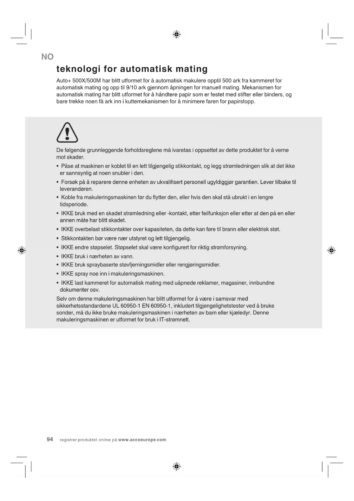 - IKKE last kammeret for automatisk mating med uåpnede reklamer, magasiner, innbundne dokumenter osv. Selv om denne makuleringsmaskinen har blitt utformet for å være i samsvar med sikkerhetsstandardene UL 60950-1 EN 60950-1, inkludert tilgjengelighetstester ved å bruke sonder, må du ikke bruke makuleringsmaskinen i nærheten av barn eller kjæledyr. Denne makuleringsmaskinen er utformet for bruk i IT-strømnett. teknologi for automatisk mating Auto+ 500X/500M har blitt utformet for å automatisk makulere opptil 500 ark fra kammeret for automatisk mating og opp til 9/10 ark gjennom åpningen for manuell mating. Mekanismen for automatisk mating har blitt utformet for å håndtere papir som er festet med stifter eller binders, og bare trekke noen få ark inn i kuttemekanismen for å minimere faren for papirstopp.AUTO+ 500X&500M MAKULERINGSMASKINEN 95