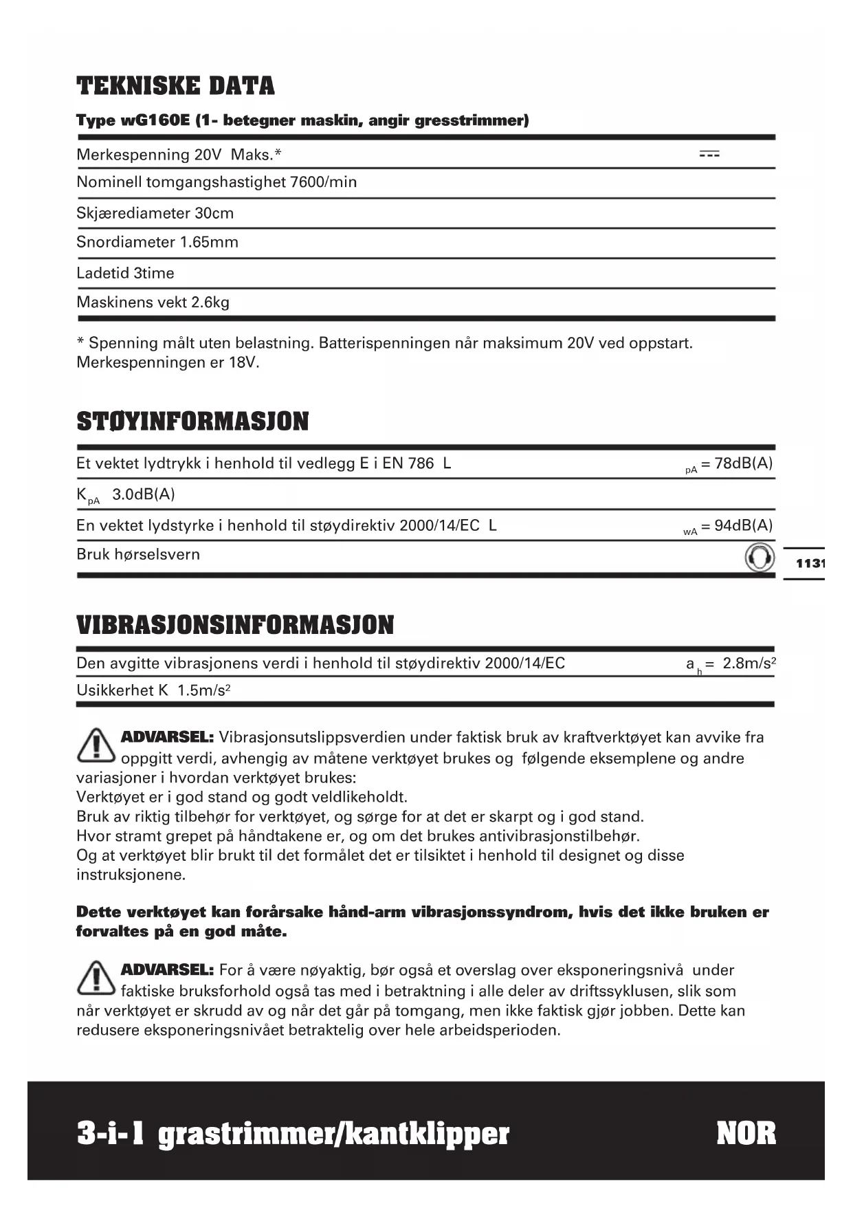 Illustrert eller beskrevet tilbehør inngår delvis ikke i leveransen.113112 3-i-1 grastrimmer/kantklipper NOR TEKNISKE DATA Type wG160E (1- betegner maskin, angir gresstrimmer) ADVARSEL: Vibrasjonsutslippsverdien under faktisk bruk av kraftverktøyet kan avvike fra oppgitt verdi, avhengig av måtene verktøyet brukes og følgende eksemplene og andre variasjoner i hvordan verktøyet brukes: Verktøyet er i god stand og godt veldlikeholdt. Bruk av riktig tilbehør for verktøyet, og sørge for at det er skarpt og i god stand. Hvor stramt grepet på håndtakene er, og om det brukes antivibrasjonstilbehør. Og at verktøyet blir brukt til det formålet det er tilsiktet i henhold til designet og disse instruksjonene. Dette verktøyet kan forårsake hånd-arm vibrasjonssyndrom, hvis det ikke bruken er forvaltes på en god måte. ADVARSEL: For å være nøyaktig, bør også et overslag over eksponeringsnivå under faktiske bruksforhold også tas med i betraktning i alle deler av driftssyklusen, slik som når verktøyet er skrudd av og når det går på tomgang, men ikke faktisk gjør jobben. Dette kan redusere eksponeringsnivået betraktelig over hele arbeidsperioden. Merkespenning 20V Maks.* Nominell tomgangshastighet 7600/min Skjærediameter 30cm Snordiameter 1.65mm Ladetid 3time Maskinens vekt 2.6kg