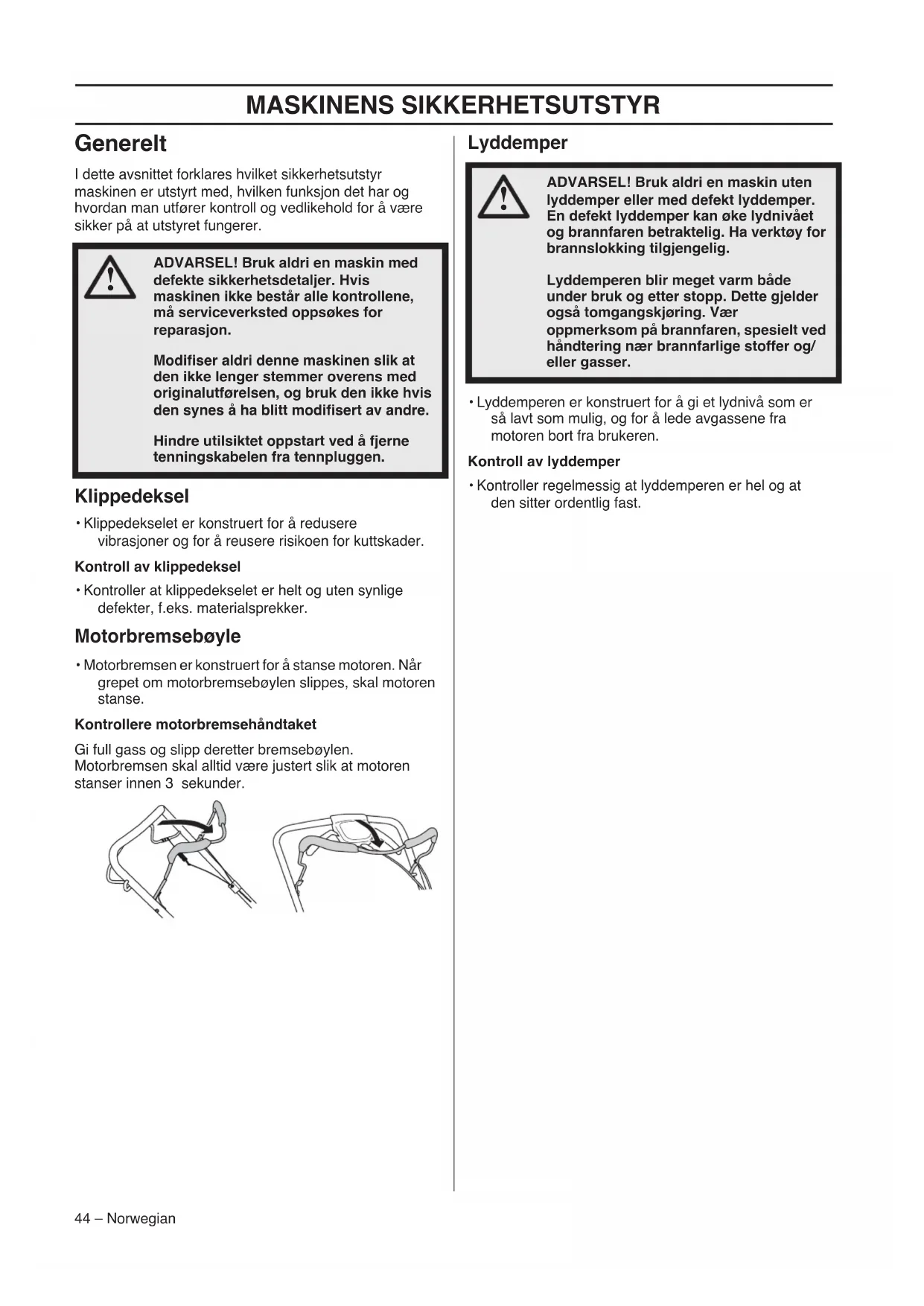 1 Motorbremsebøyle 2 Kjørehåndtak 3 Starthåndtak 4 Oppsamler 5 Håndtak, håndtakets høyde 6 Klippehøydehendel 7 Peilepinne/oljepåfylling 8 Lyddemper 9 Tennplugg 10 Luftfilter 11 Klippedeksel 12 Drivstoffkran 13 Vanntilkopling 14 Brenselpåfylling 15 Kniv 16 Fjærskive 17 Knivbolt 18 BruksanvisningMASKINENS SIKKERHETSUTSTYR 44 – Norwegian Generelt I dette avsnittet forklares hvilket sikkerhetsutstyr maskinen er utstyrt med, hvilken funksjon det har og hvordan man utfører kontroll og vedlikehold for å være sikker på at utstyret fungerer. Klippedeksel