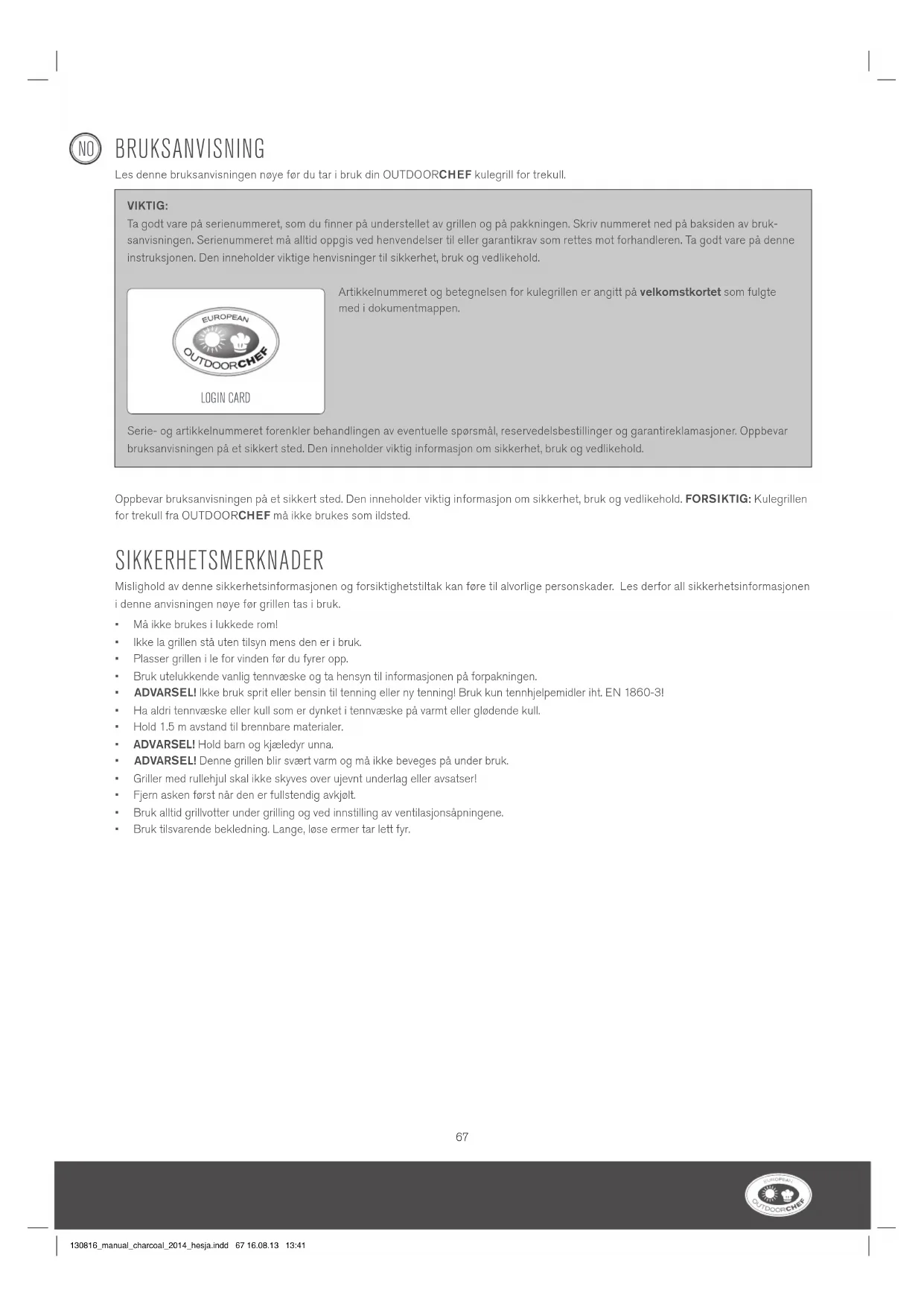BRUkSANVISNINg Les denne bruksanvisningen nøye før du tar i bruk din OUTDOORCHEF kulegrill for trekull. Oppbevar bruksanvisningen på et sikkert sted. Den inneholder viktig informasjon om sikkerhet, bruk og vedlikehold. FORSIKTIG: Kulegrillen for trekull fra OUTDOORCHEF må ikke brukes som ildsted. SIkkERHETSMERkNAdER Mislighold av denne sikkerhetsinformasjonen og forsiktighetstiltak kan føre til alvorlige personskader. Les derfor all sikkerhetsinformasjonen i denne anvisningen nøye før grillen tas i bruk.
