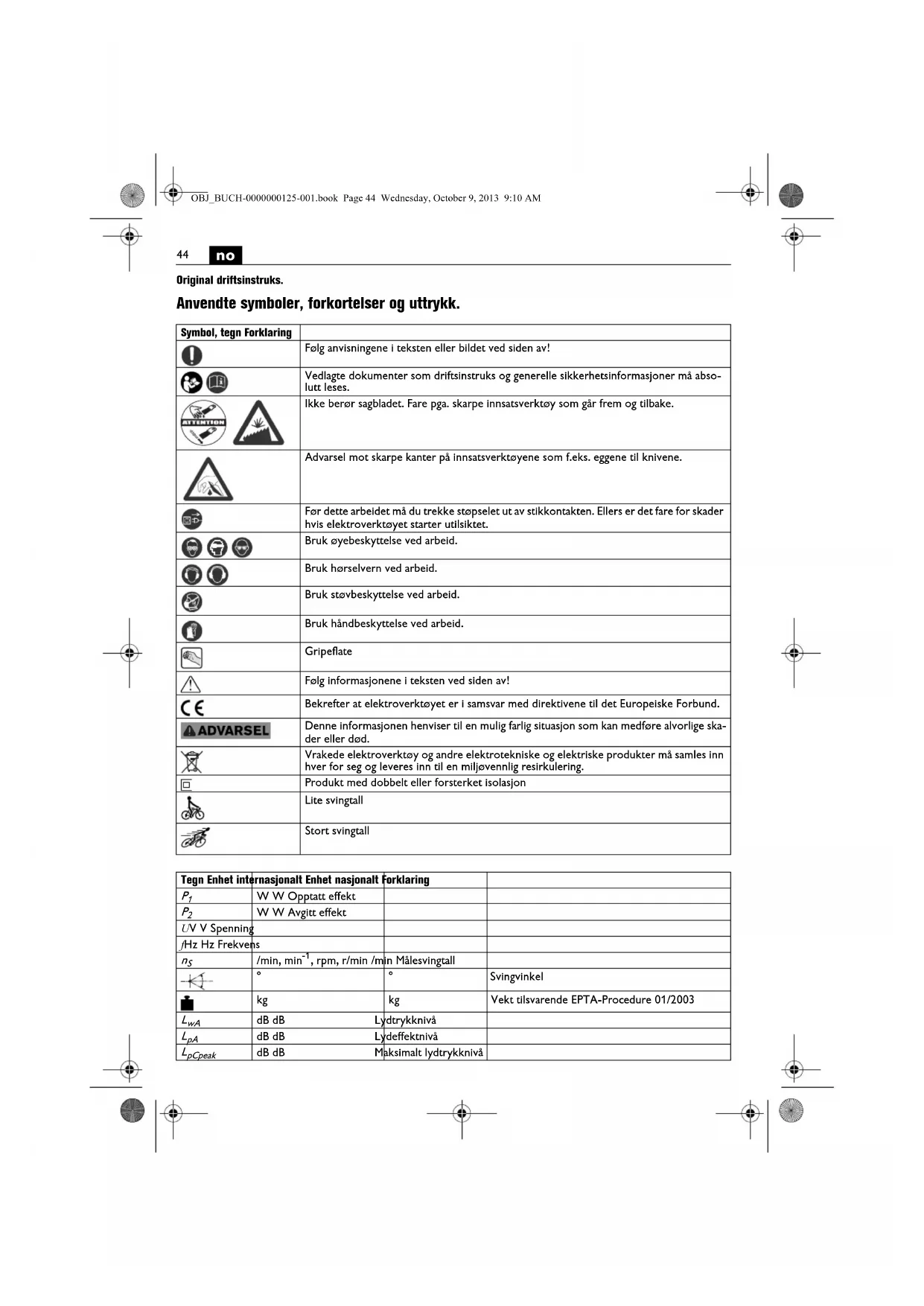 Det angitte svingningsnivae representer de vanilge anvendelsene til elektro-verktoyet. Men hvis elektroverktoyet brukes til andre anvendelser, med avvikende innsatsverktoyer utilstrekkelig vedlikehold, kan svingningsnivae avike. Dette kan oke vibrasjonsbelastningen tydelig for hele arbeidstiden.