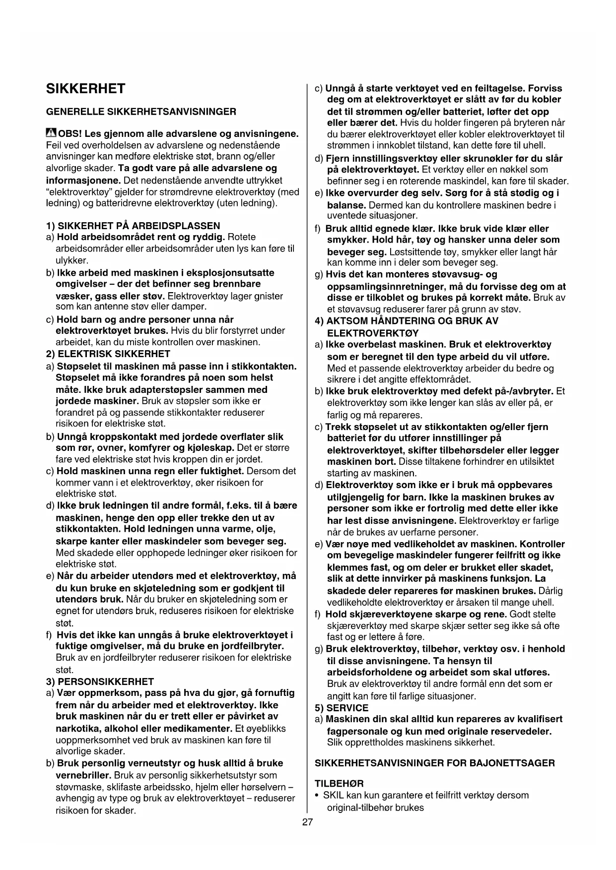 SIKKERHET GENERELLE SIKKERHETSANVISNINGER OBS! Les gjennom alle advarslene og anvisningene.