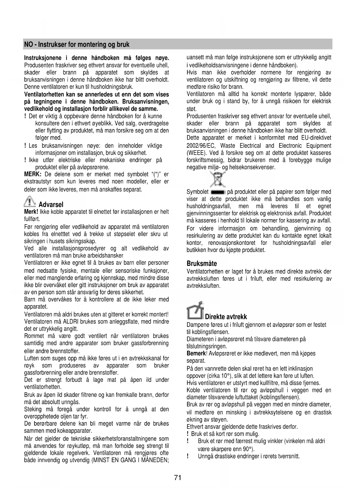 Merk! Ikke koble apparatet til elnettet før installasjonen er helt