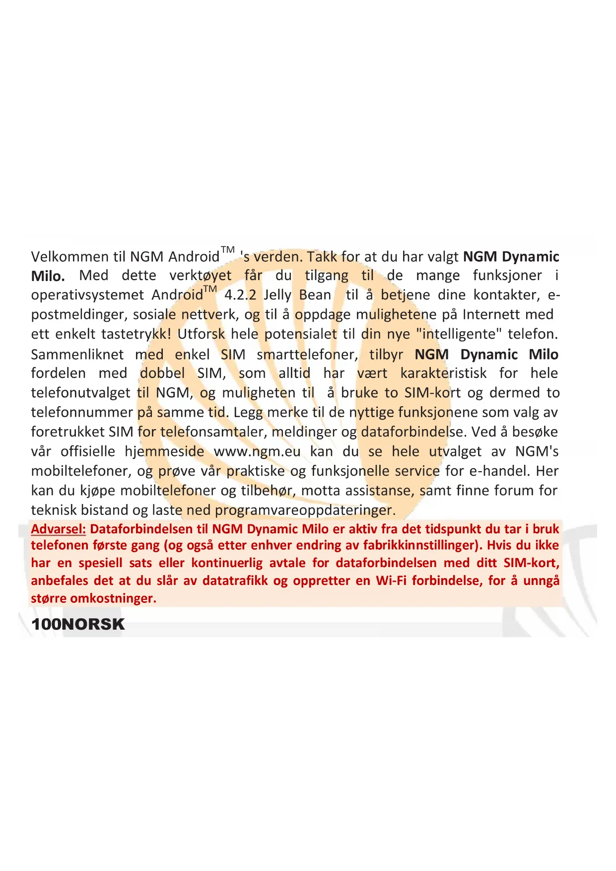 Merk: det er mulig å bruke følgende filformat som ringetoner *mid,*wav,*ogg o *mp3.111NORSK Legge inn SMS og MMS Lese SMS og MMS: når du mottar en ny SMS eller MMS, ser du et ikon i varselpanelet. Hvis du klikker på ikonet er det mulig å gå direkte inn og lese den mottatte meldingen. Det er i alle tilfeller mulig å se innkomne meldinger på startskjermen eller på hovedmenyen ved å velge Meldinger. Sende SMS og MMS Fra startsiden eller hovedmenyen velger du Meldinger eller ikonet nederst. Skriv inn de første bokstavene i et navn i mottakerfeltet for å søke en kontakt og velg denne fra pop-up lenken eller skriv inn nummeret til mottaker direkte, eller velg ikonet ved feltet og finn mottaker/e. Skriv inn teksten med det virtuelle tastaturet. Velg det grønne ikonet “+” for å legge ved eventuelle multimedia vedlegg (meldingen blir konvertert til MMS) og trykk og velg ønsket SIM-kort. TILKOBLING: for å utnytte bedre potensialet til terminalen og operativsystemet er det nødvendig å ha en aktiv dataforbindelse; Dataforbindelsen til NGM Dynamic Milo er aktiv fra det øyeblikk du første gang slår på telefonen. Hvis det ikke er oppgitt annet i abonnementet, medfører datatrafikken kostnader; vi anbefaler derfor å konfigurere Internett tilgangen via WiFi. For å aktivere datatrafikk på et av SIM-kortene velger du Innstillinger > Betjene SIM > Dataforbindelse, eller aktiver den med knappen for hurtiginnstillinger i meldingspanelet.112 NORSK Koble til Internett med WiFi funksjonen®: du kan koble deg på WLAN nettet ved å bruke WiFi funksjonen. For å aktivere den fra hovedmenyen velg Innstillinger > WiFi. Ta hensyn til alle advarsler og retningslinjer fra autorisert personell når du befinner deg i områder der bruk av trådløse enheter er begrenset (fly, sykehus, o.l.). Bruk avslått modus når du bruker tjenester som ikke krever nettilgang.