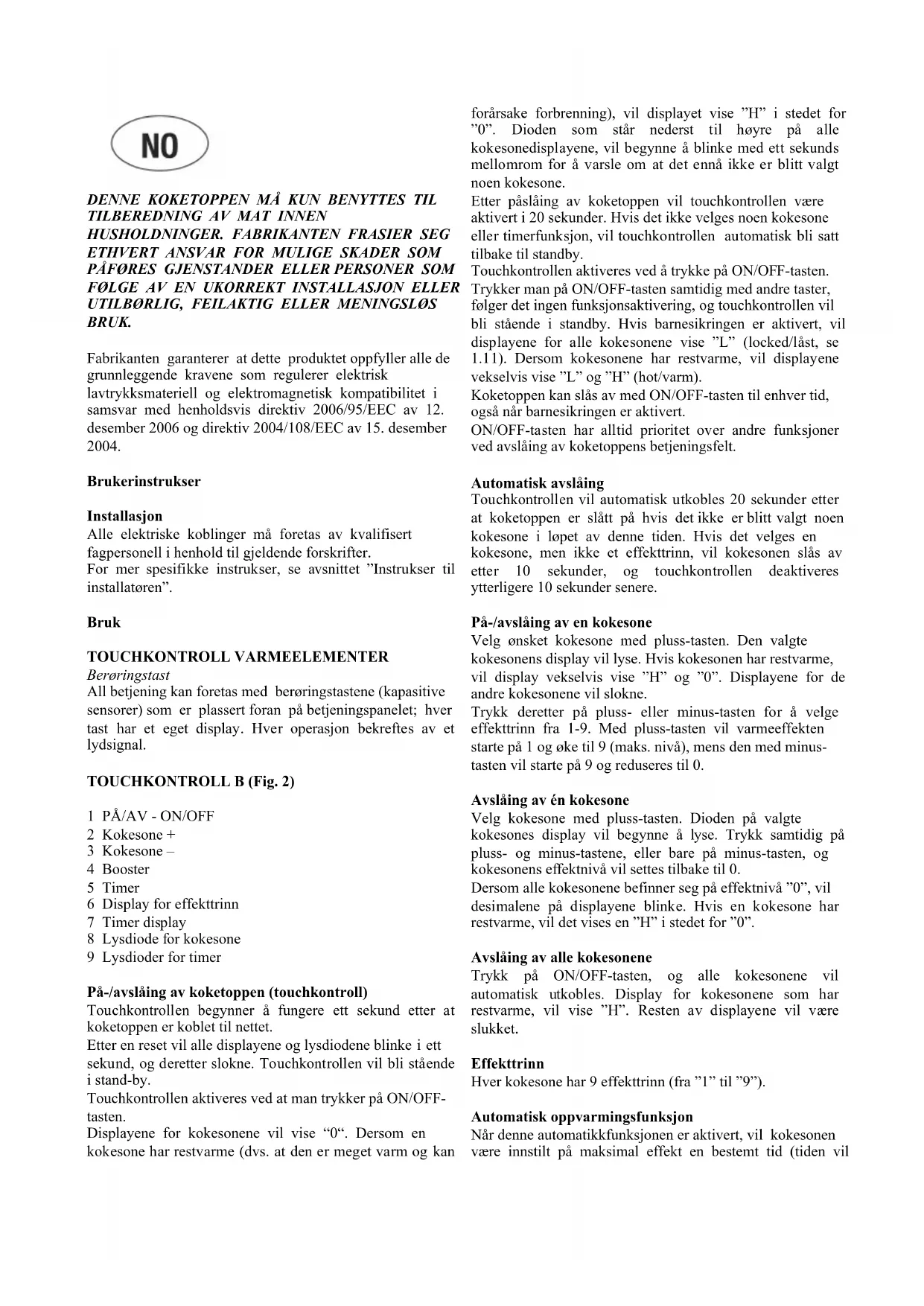 2 Kokesone + 3 Kokesone – 4 Booster 5 Timer 6 Display for effekttrinn 7 Timer display 8 Lysdiode for kokesone 9 Lysdioder for timer På-/avslåing av koketoppen (touchkontroll) Touchkontrollen begynner å fungere ett sekund etter at koketoppen er koblet til nettet. Etter en reset vil alle displayene og lysdiodene blinke i ett sekund, og deretter slokne. Touchkontrollen vil bli stående i stand-by. Touchkontrollen aktiveres ved at man trykker på ON/OFF- tasten. Displayene for kokesonene vil vise “0“. Dersom en kokesone har restvarme (dvs. at den er meget varm og kan forårsake forbrenning), vil displayet vise ”H” i stedet for ”0”. Dioden som står nederst til høyre på alle kokesonedisplayene, vil begynne å blinke med ett sekunds mellomrom for å varsle om at det ennå ikke er blitt valgt noen kokesone. Etter påslåing av koketoppen vil touchkontrollen være aktivert i 20 sekunder. Hvis det ikke velges noen kokesone eller timerfunksjon, vil touchkontrollen automatisk bli satt tilbake til standby. Touchkontrollen aktiveres ved å trykke på ON/OFF-tasten. Trykker man på ON/OFF-tasten samtidig med andre taster, følger det ingen funksjonsaktivering, og touchkontrollen vil bli stående i standby. Hvis barnesikringen er aktivert, vil displayene for alle kokesonene vise ”L” (locked/låst, se 1.11). Dersom kokesonene har restvarme, vil displayene vekselvis vise ”L” og ”H” (hot/varm). Koketoppen kan slås av med ON/OFF-tasten til enhver tid, også når barnesikringen er aktivert. ON/OFF-tasten har alltid prioritet over andre funksjoner ved avslåing av koketoppens betjeningsfelt. Automatisk avslåing Touchkontrollen vil automatisk utkobles 20 sekunder etter at koketoppen er slått på hvis det ikke er blitt valgt noen kokesone i løpet av denne tiden. Hvis det velges en kokesone, men ikke et effekttrinn, vil kokesonen slås av etter 10 sekunder, og touchkontrollen deaktiveres ytterligere 10 sekunder senere. På-/avslåing av en kokesone Velg ønsket kokesone med pluss-tasten. Den valgte kokesonens display vil lyse. Hvis kokesonen har restvarme, vil display vekselvis vise ”H” og ”0”. Displayene for de andre kokesonene vil slokne. Trykk deretter på pluss- eller minus-tasten for å velge effekttrinn fra 1-9. Med pluss-tasten vil varmeeffekten starte på 1 og øke til 9 (maks. nivå), mens den med minus- tasten vil starte på 9 og reduseres til 0. Avslåing av én kokesone Velg kokesone med pluss-tasten. Dioden på valgte kokesones display vil begynne å lyse. Trykk samtidig på pluss- og minus-tastene, eller bare på minus-tasten, og kokesonens effektnivå vil settes tilbake til 0. Dersom alle kokesonene befinner seg på effektnivå ”0”, vil desimalene på displayene blinke. Hvis en kokesone har restvarme, vil det vises en ”H” i stedet for ”0”. Avslåing av alle kokesonene Trykk på ON/OFF-tasten, og alle kokesonene vil automatisk utkobles. Display for kokesonene som har restvarme, vil vise ”H”. Resten av displayene vil være slukket. Effekttrinn Hver kokesone har 9 effekttrinn (fra ”1” til ”9”). Automatisk oppvarmingsfunksjon Når denne automatikkfunksjonen er aktivert, vil kokesonen være innstilt på maksimal effekt en bestemt tid (tiden vilavhenge av det effekttrinnet som er valgt). Deretter vil kokesonen settes tilbake til forhåndsstilt effekt. Aktivering av den automatiske oppvarmingsfunksjonen: - Slå på koketoppen, og velg kokesone. - Etter at kokesonen har nådd effekttrinn 9, aktiver oppvarmingsautomatikken ved å trykke på pluss-tasten. - Trykk på pluss- og minus-tastene for å innstille ønsket varmeeffekt. Display vil vise valgt effektnivå. - Tre sekunder etter siste tastetrykk (valg av effektnivå), og innen 16 sekunder etter aktivering av automatikkfunksjonen, vil display vekselvis vise symbolet ”A” (som angir effektøkning) og valgt effektnivå. - Bruk minus-tasten til å velge et lavere effektnivå. Automatikkfunksjonen vil avbrytes i det øyeblikk “A” vises på display. - For valg av et høyere effektnivå, bruk pluss-tasten. Automatikkfunksjonen vil i dette tilfellet tilpasses forhåndsstilt effekttrinn. - Etter endt oppvarmingstid vil display vise tidligere valgte effektnivå. Restvarmeindikator Restvarmeindikatoren varsler bruker om at temperaturen på kokesonens keramiske glassflate er meget høy og vil kunne forårsake brannsår ved berøring. Temperaturen beregnes ut ifra en matematisk modell, og i henhold til denne angis restvarmen med “H” på det respektive syvsegment- displayet. Oppvarmingen og avkjølingen beregnes på grunnlag av: . Valgt effektnivå (mellom “0” og “9”). . Aktiveringsperiode. Etter at kokesonen er slått av, vil display vise “H” helt til kokesonens temperatur har sunket under ≤ 60ºC. Automatisk OFF-funksjon (begrenset driftstid) Dette er en sikkerhetsfunksjon. Driftstiden avhenger av innstilt varmeeffekt. Hver kokesone vil automatisk bli slått av etter en forhåndsprogrammert tid hvis det ikke stilles et nytt effekttrinn før denne tiden løper ut. Enhver effektinnstilling på en kokesone (med pluss- og minus-tastene) vil gjenopprette maksimal koketid og først valgte effektnivå. Sikring mot utilsiktet påslåing . Hvis en tast trykkes uavbrutt i mer enn 10 sekunder, vil koketoppen automatisk kobles ut. Touchkontrollen vil avgi et akustisk signal i 10 sekunder for å gjøre bruker oppmerksom på at en eller annen gjenstand er kommet i kontakt med betjeningstastene. Display vil vise feilkoden ”E R 0 3”. Hvis kokesonen har restvarme, vil ”H” og feilkoden vekselvis vises på display. . Hvis det ikke aktiveres noen kokesone innen 20 sekunder etter at koketoppen er slått på, vil touchkontrollen gå tilbake til standby-modus. . ON/OFF-tasten har prioritet over de andre tastene. Dette betyr at koketoppen kan slås av på ethvert tidspunkt. . På standby-modus vil en kontinuerlig tastetrykking ikke utløse noe signal. Touchkontrollen kan imidlertid kun re
