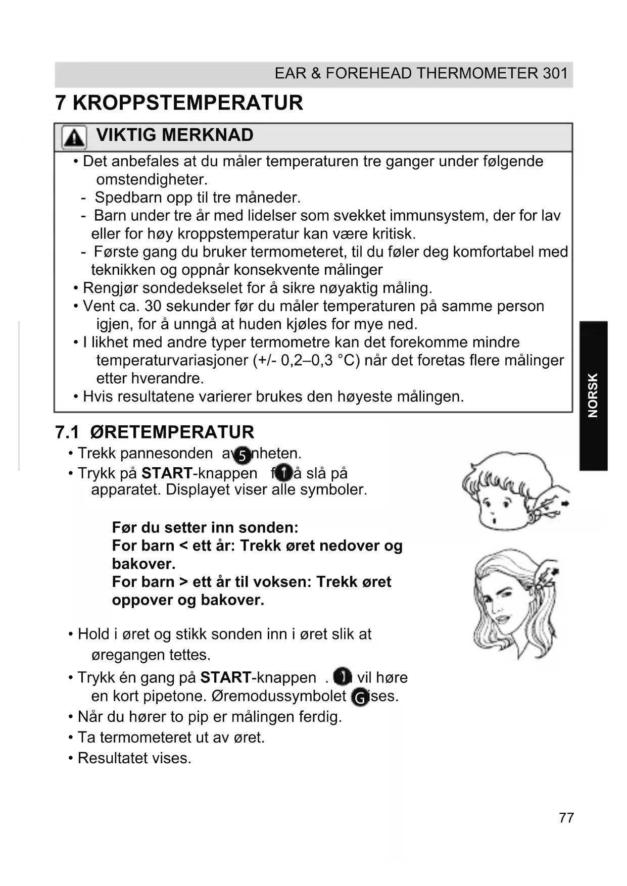 - Oppbevar enheten utilgjengelig for barn. Hvis barn prøver å måle temperaturen selv, kan det føre til øreskade. Hvis batteriet svelges ved et uhell må lege kontaktes umiddelbart.76