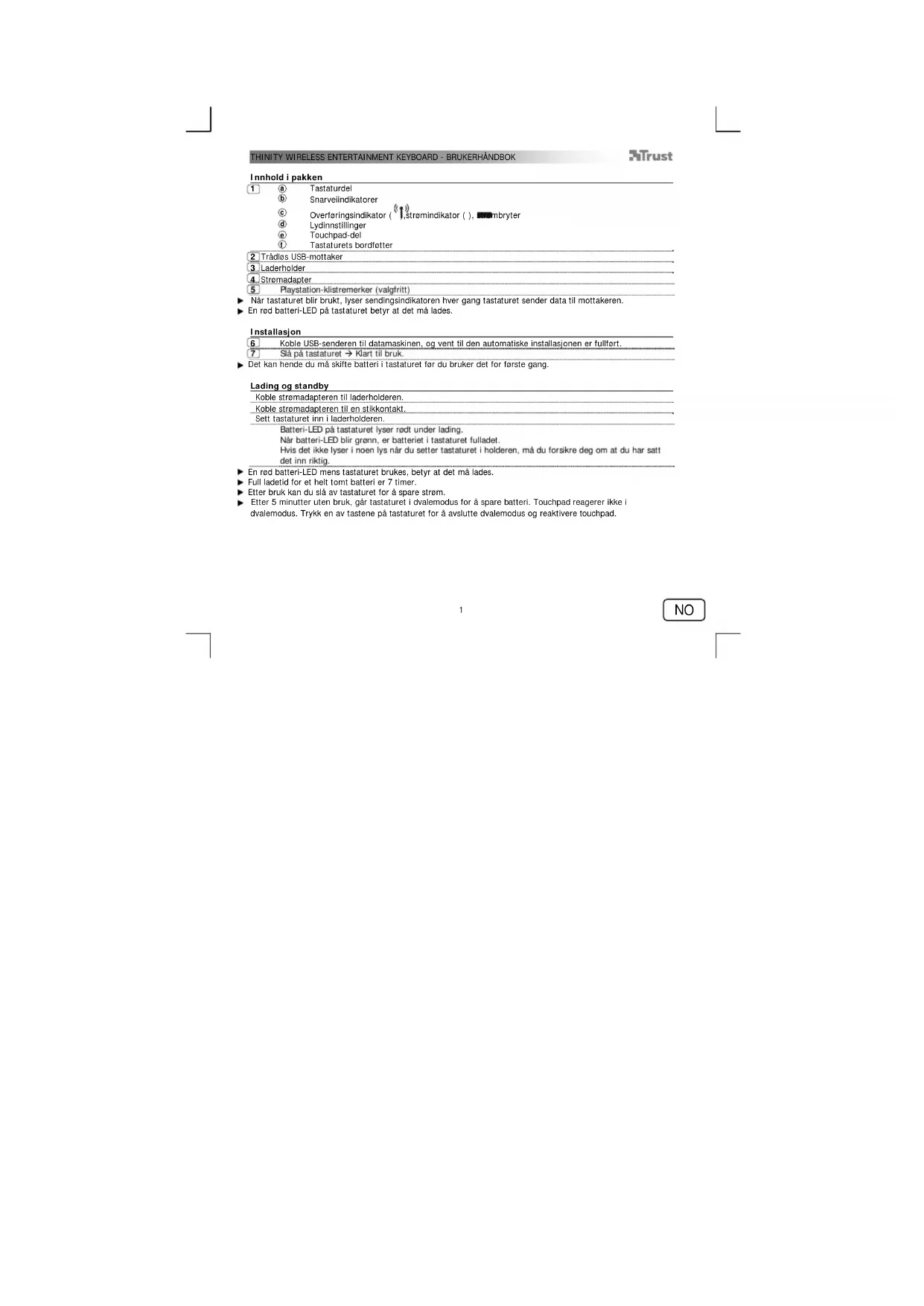 Tastaturets bordføtter 2 Trådløs USB-mottaker 3 Laderholder 4 Strømadapter 5 Playstation-klistremerker (valgfritt) Når tastaturet blir brukt, lyser sendingsindikatoren hver gang tastaturet sender data til mottakeren. En rød batteri-LED på tastaturet betyr at det må lades. Installasjon 6 Koble USB-senderen til datamaskinen, og vent til den automatiske installasjonen er fullført. 7 Slå på tastaturet Klart til bruk. Det kan hende du må skifte batteri i tastaturet før du bruker det for første gang. Lading og standby Koble strømadapteren til laderholderen. Koble strømadapteren til en stikkontakt. Sett tastaturet inn i laderholderen. Batteri-LED på tastaturet lyser rødt under lading. Når batteri-LED blir grønn, er batteriet i tastaturet fulladet. Hvis det ikke lyser i noen lys når du setter tastaturet i holderen, må du forsikre deg om at du har satt det inn riktig. En rød batteri-LED mens tastaturet brukes, betyr at det må lades. Full ladetid for et helt tomt batteri er 7 timer. Etter bruk kan du slå av tastaturet for å spare strøm. Etter 5 minutter uten bruk, går tastaturet i dvalemodus for å spare batteri. Touchpad reagerer ikke i dvalemodus. Trykk en av tastene på tastaturet for å avslutte dvalemodus og reaktivere touchpad.THINITY WIRELESS ENTERTAINMENT KEYBOARD - BRUKERHÅNDBOK