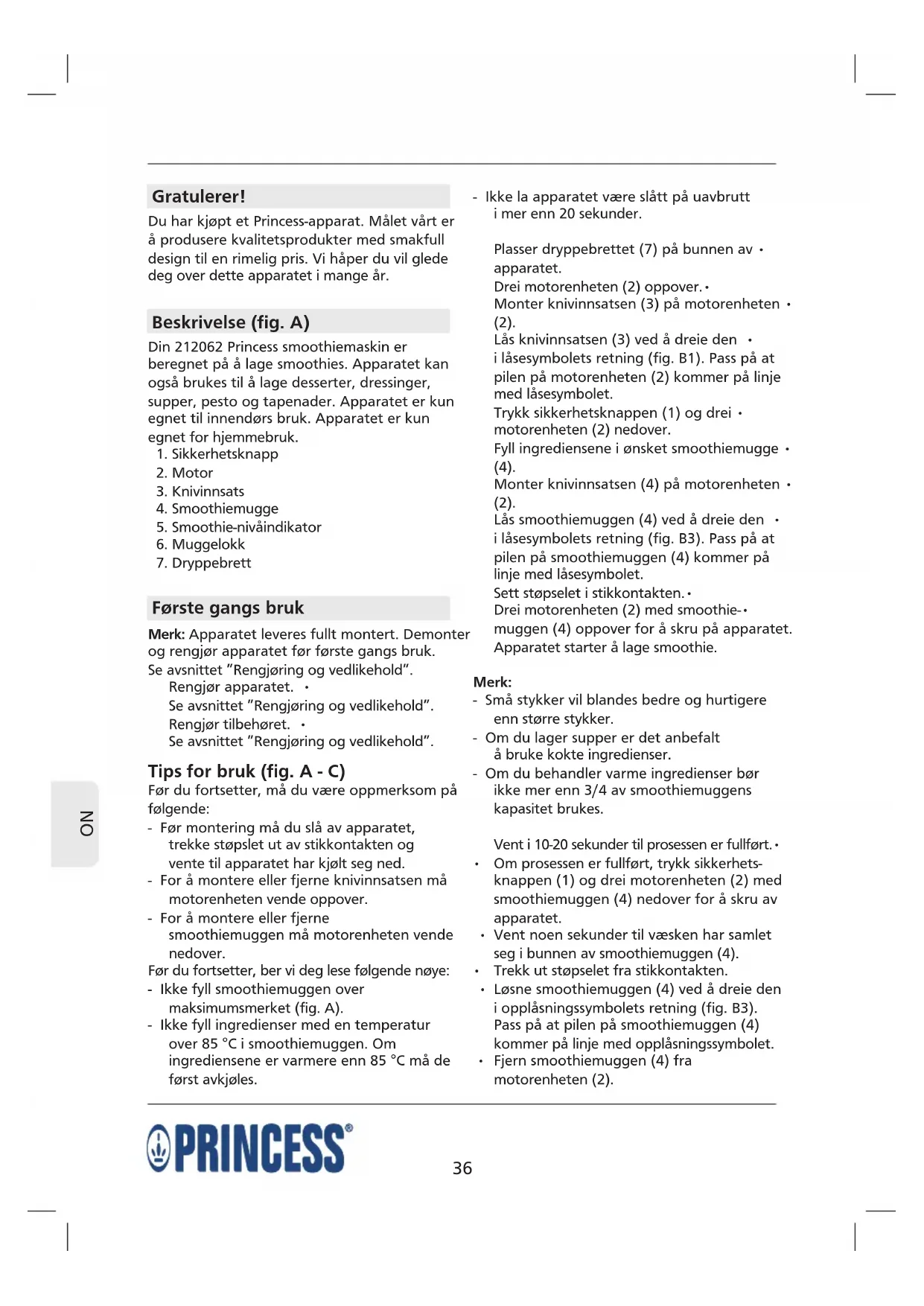 Gratulerer! Du har kjøpt et Princess-apparat. Målet vårt er å produsere kvalitetsprodukter med smakfull design til en rimelig pris. Vi håper du vil glede deg over dette apparatet i mange år. Beskrivelse (fig. A) Din 212062 Princess smoothiemaskin er beregnet på å lage smoothies. Apparatet kan også brukes til å lage desserter, dressinger, supper, pesto og tapenader. Apparatet er kun egnet til innendørs bruk. Apparatet er kun egnet for hjemmebruk.