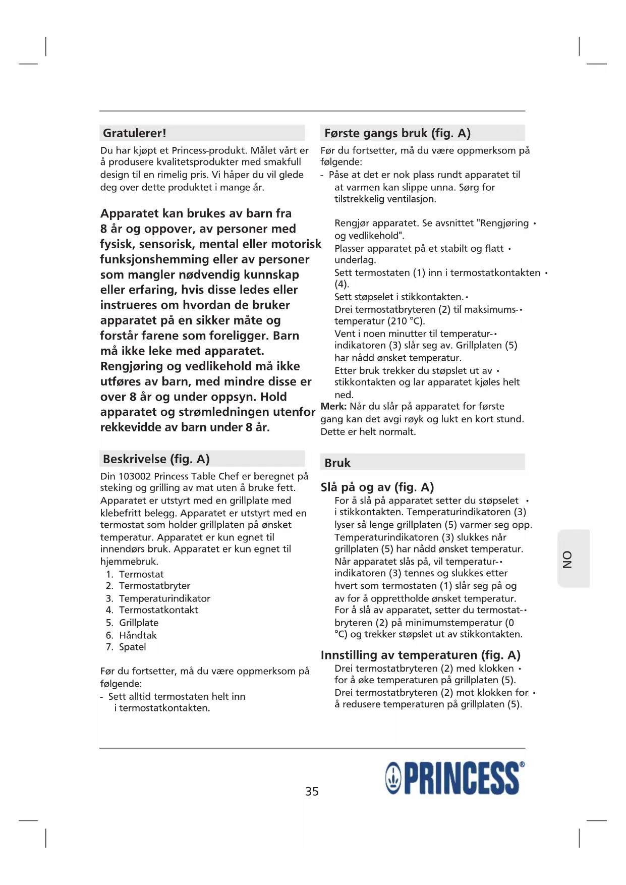 Gratulerer! Du har kjøpt et Princess-produkt. Målet vårt er å produsere kvalitetsprodukter med smakfull design til en rimelig pris. Vi håper du vil glede deg over dette produktet i mange år. Apparatet kan brukes av barn fra 8 år og oppover, av personer med fysisk, sensorisk, mental eller motorisk funksjonshemming eller av personer som mangler nødvendig kunnskap eller erfaring, hvis disse ledes eller instrueres om hvordan de bruker apparatet på en sikker måte og forstår farene som foreligger. Barn må ikke leke med apparatet. Rengjøring og vedlikehold må ikke utføres av barn, med mindre disse er over 8 år og under oppsyn. Hold apparatet og strømledningen utenfor rekkevidde av barn under 8 år. Beskrivelse (fig. A) Din 103002 Princess Table Chef er beregnet på steking og grilling av mat uten å bruke fett. Apparatet er utstyrt med en grillplate med klebefritt belegg. Apparatet er utstyrt med en termostat som holder grillplaten på ønsket temperatur. Apparatet er kun egnet til innendørs bruk. Apparatet er kun egnet til hjemmebruk.