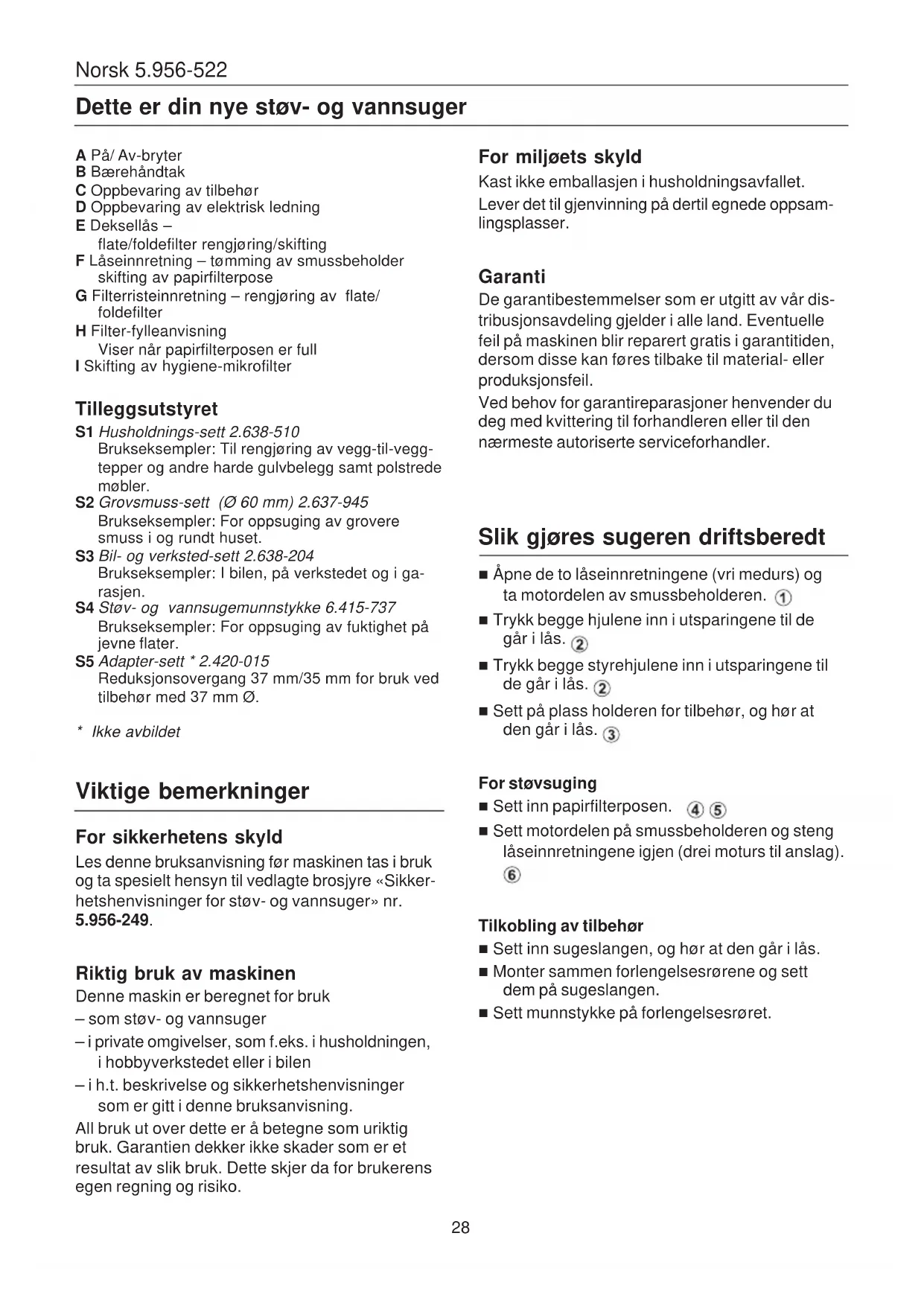 Les denne bruksanvisning før maskinen tas i bruk og ta spesielt hensyn til vedlagte brosjyre «Sikkerhetshenvisninger for støv- og vannsuger» nr.