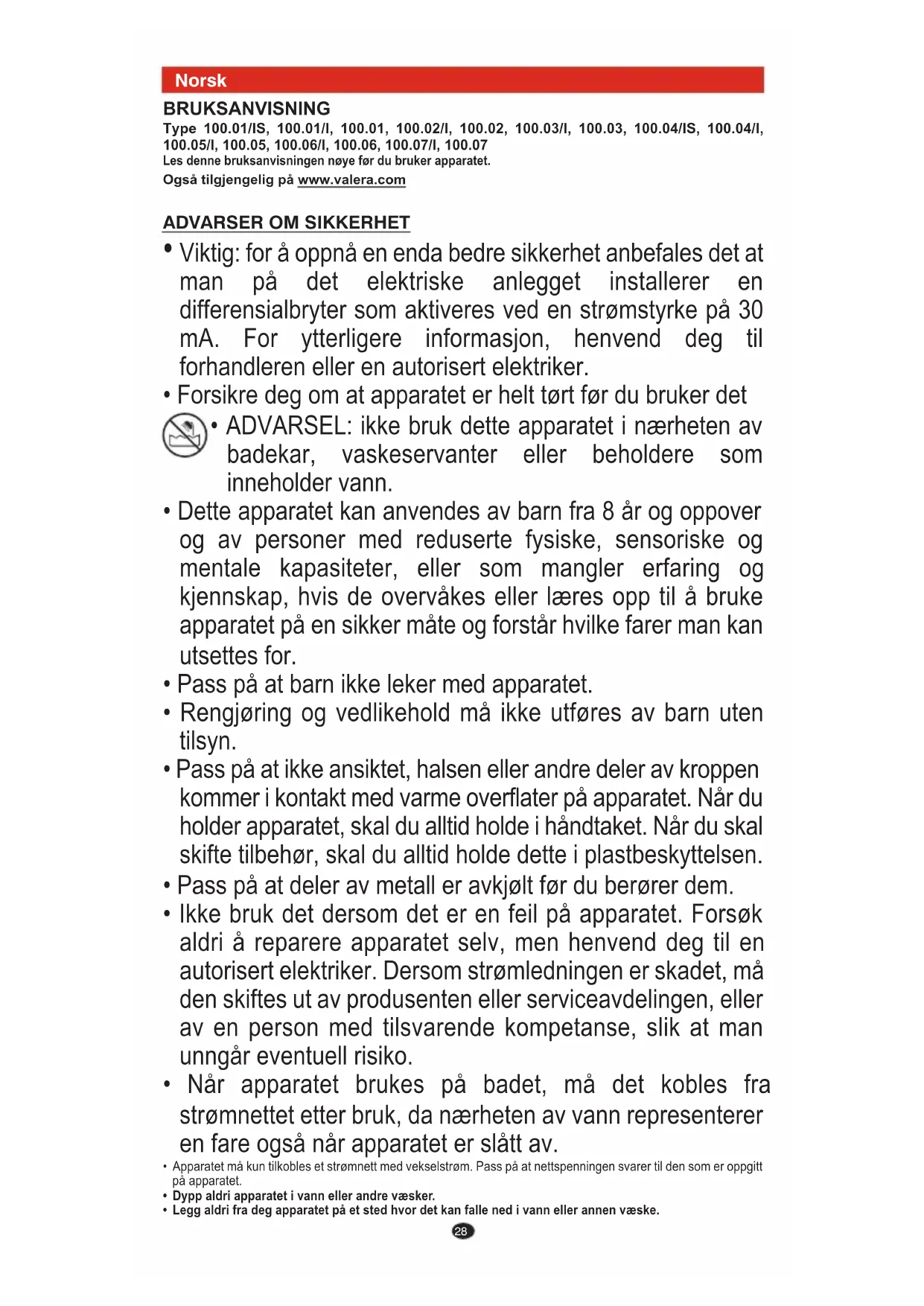 Les denne bruksanvisningen nøye før du bruker apparatet. Også tilgjengelig på www.valera.com ADVARSER OM SIKKERHET