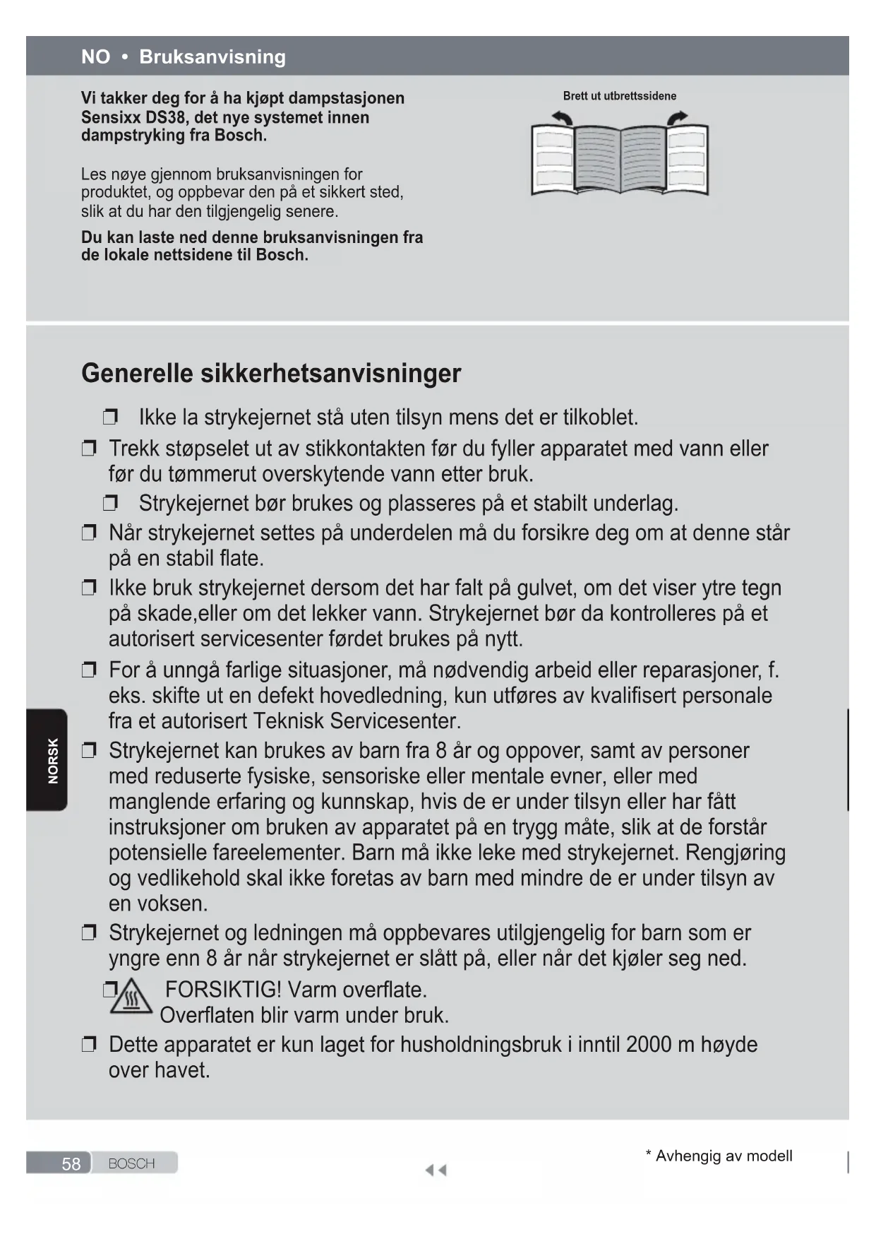 Hvis ovenstående ikke løser problemet, skal du kontakte autoriseret teknisk service.58 B O S C H * Avhengig av modell NorSk Vi takker deg for å ha kjøpt dampstasjonen
