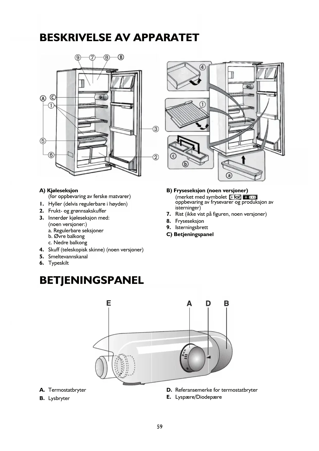 Typeskilt B) Fryseseksjon (noen versjoner) (merket med symbolet for oppbevaring av frysevarer og produksjon av isterninger)