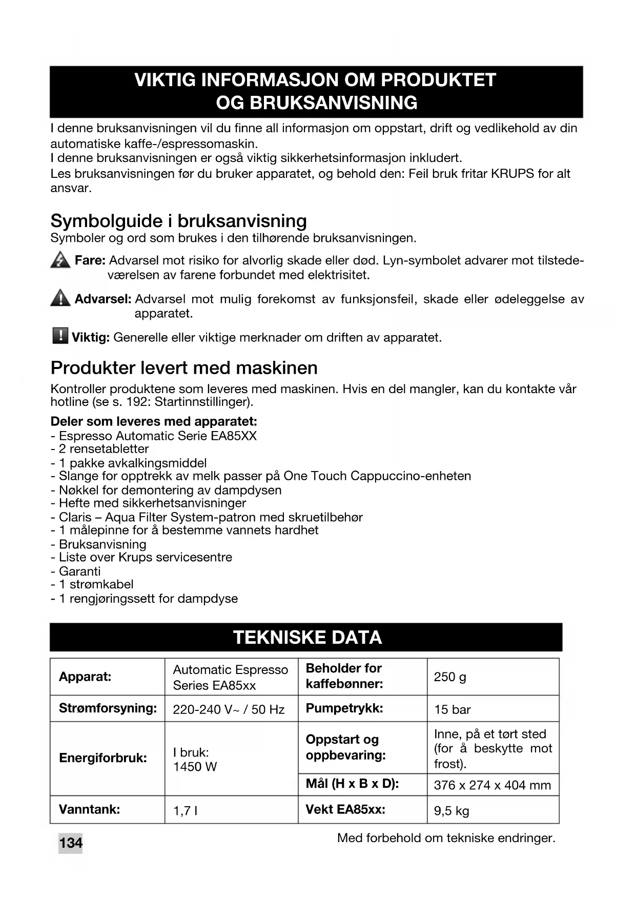 INNHOLDSFORTEGNELSE NO IFU_KR_EA85_EO_0A17613_EA85 10/09/13 11:34 Page133134