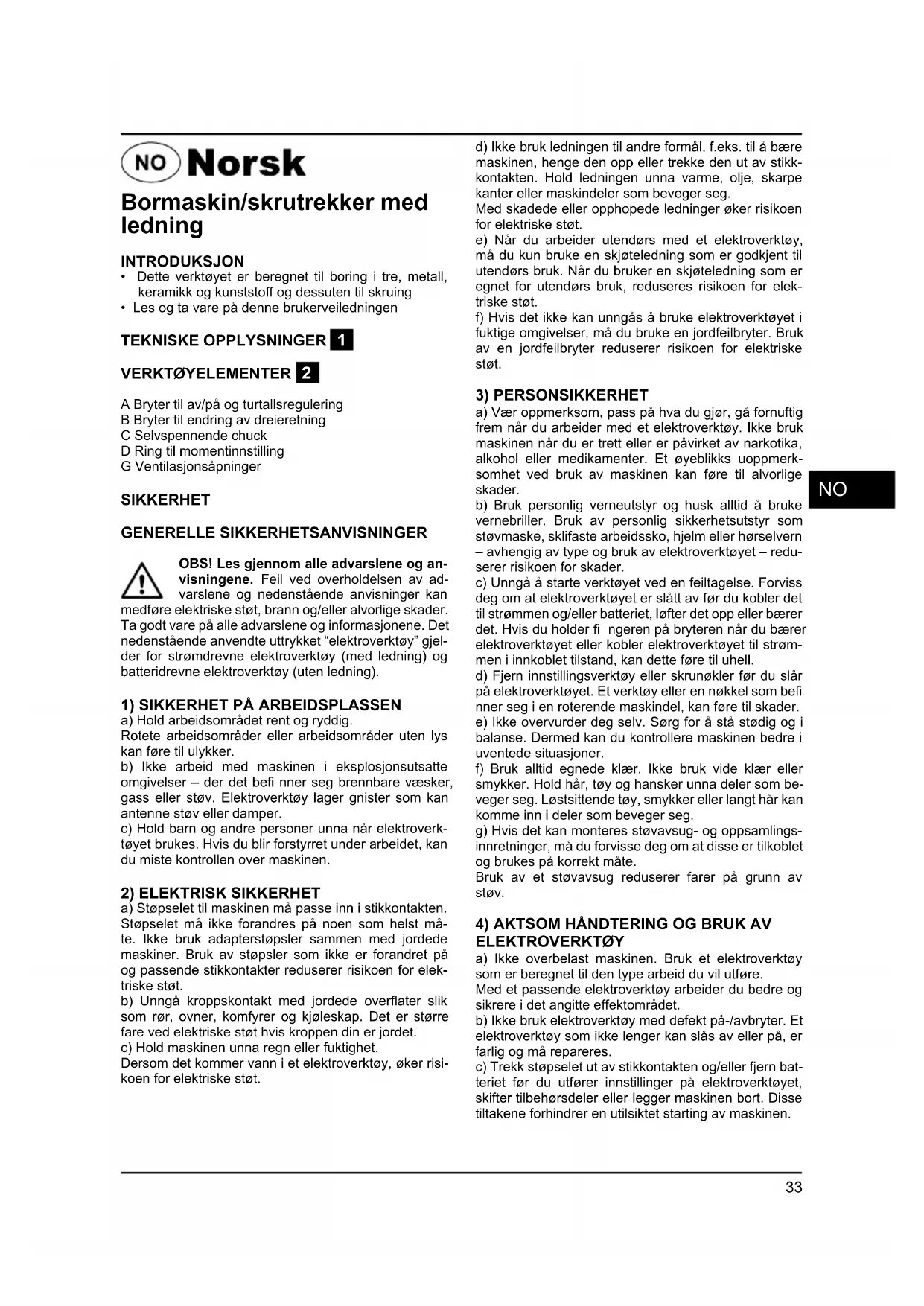 - Les og ta vare på denne brukerveiledningen TEKNISKE OPPLYSNINGER 1 VERKTØYELEMENTER 2 A Bryter til av/på og turtallsregulering B Bryter til endring av dreieretning C Selvspennende chuck D Ring til momentinnstilling G Ventilasjonsåpninger SIKKERHET GENERELLE SIKKERHETSANVISNINGER OBS! Les gjennom alle advarslene og an- visningene. Feil ved overholdelsen av ad- varslene og nedenstående anvisninger kan medføre elektriske støt, brann og/eller alvorlige skader. Ta godt vare på alle advarslene og informasjonene. Det nedenstående anvendte uttrykket “elektroverktøy” gjel- der for strømdrevne elektroverktøy (med ledning) og batteridrevne elektroverktøy (uten ledning).