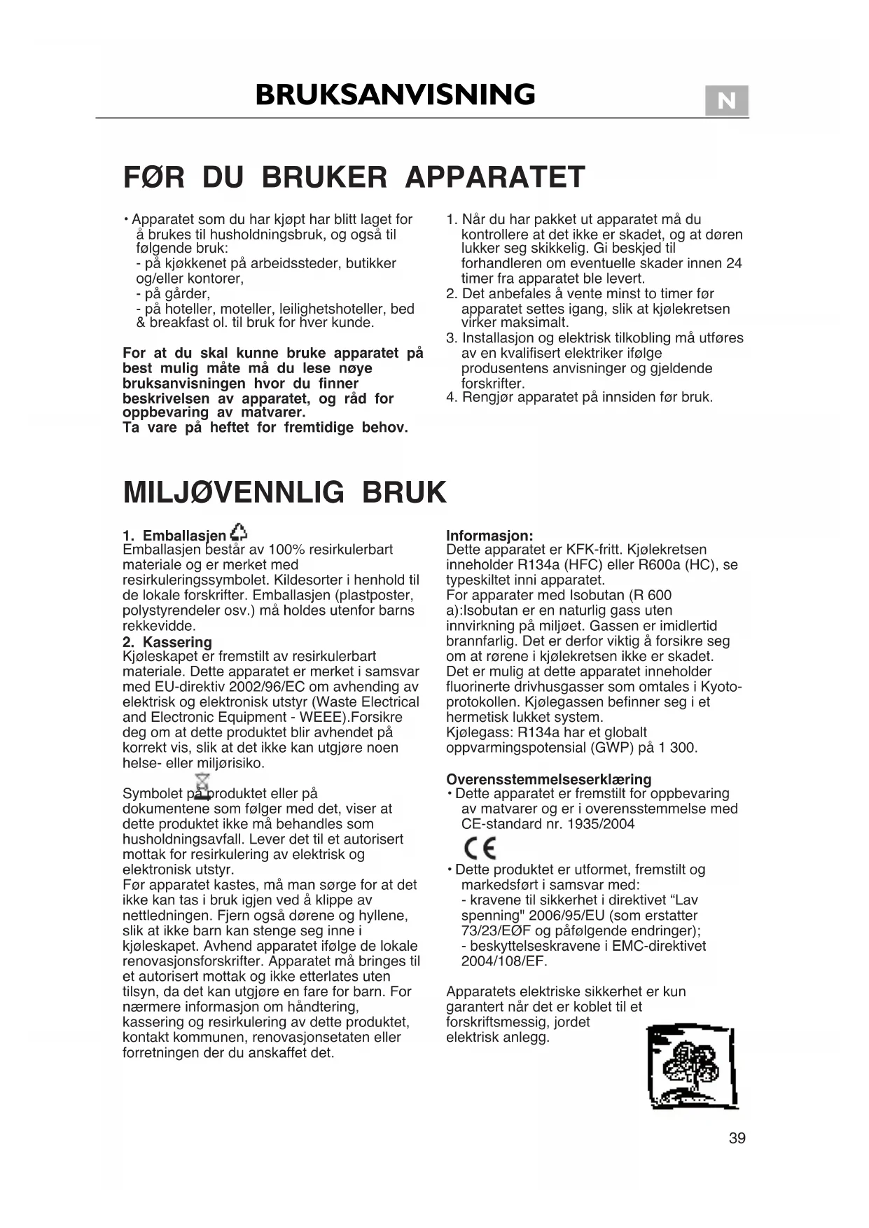 FØR DU BRUKER APPARATET • Apparatet som du har kjøpt har blitt laget forå brukes til husholdningsbruk, og også tilfølgende bruk:- på kjøkkenet på arbeidssteder, butikkerog/eller kontorer,- på gårder,- på hoteller, moteller, leilighetshoteller, bed& breakfast ol. til bruk for hver kunde.For at du skal kunne bruke apparatet påbest mulig måte må du lese nøyebruksanvisningen hvor du finnerbeskrivelsen av apparatet, og råd foroppbevaring av matvarer.Ta vare på heftet for fremtidige behov.1. Når du har pakket ut apparatet må dukontrollere at det ikke er skadet, og at dørenlukker seg skikkelig. Gi beskjed tilforhandleren om eventuelle skader innen 24timer fra apparatet ble levert.2. Det anbefales å vente minst to timer førapparatet settes igang, slik at kjølekretsenvirker maksimalt.3. Installasjon og elektrisk tilkobling må utføresav en kvalifisert elektriker ifølgeprodusentens anvisninger og gjeldendeforskrifter.4. Rengjør apparatet på innsiden før bruk.1. EmballasjenEmballasjen består av 100% resirkulerbartmateriale og er merket medresirkuleringssymbolet. Kildesorter i henhold tilde lokale forskrifter. Emballasjen (plastposter,polystyrendeler osv.) må holdes utenfor barnsrekkevidde.2. KasseringKjøleskapet er fremstilt av resirkulerbartmateriale. Dette apparatet er merket i samsvarmed EU-direktiv 2002/96/EC om avhending avelektrisk og elektronisk utstyr (Waste Electricaland Electronic Equipment - WEEE).Forsikredeg om at dette produktet blir avhendet påkorrekt vis, slik at det ikke kan utgjøre noenhelse- eller miljørisiko.Symbolet på produktet eller pådokumentene som følger med det, viser atdette produktet ikke må behandles somhusholdningsavfall. Lever det til et autorisertmottak for resirkulering av elektrisk ogelektronisk utstyr.Før apparatet kastes, må man sørge for at detikke kan tas i bruk igjen ved å klippe avnettledningen. Fjern også dørene og hyllene,slik at ikke barn kan stenge seg inne ikjøleskapet. Avhend apparatet ifølge de lokalerenovasjonsforskrifter. Apparatet må bringes tilet autorisert mottak og ikke etterlates utentilsyn, da det kan utgjøre en fare for barn. Fornærmere informasjon om håndtering,kassering og resirkulering av dette produktet,kontakt kommunen, renovasjonsetaten ellerforretningen der du anskaffet det.Informasjon:Dette apparatet er KFK-fritt. Kjølekretseninneholder R134a (HFC) eller R600a (HC), setypeskiltet inni apparatet.For apparater med Isobutan (R 600a):Isobutan er en naturlig gass uteninnvirkning på miljøet. Gassen er imidlertidbrannfarlig. Det er derfor viktig å forsikre segom at rørene i kjølekretsen ikke er skadet.Det er mulig at dette apparatet inneholderfluorinerte drivhusgasser som omtales i Kyoto-protokollen. Kjølegassen befinner seg i ethermetisk lukket system.Kjølegass: R134a har et globaltoppvarmingspotensial (GWP) på 1 300.Overensstemmelseserklæring• Dette apparatet er fremstilt for oppbevaringav matvarer og er i overensstemmelse medCE-standard nr. 1935/2004• Dette produktet er utformet, fremstilt ogmarkedsført i samsvar med:- kravene til sikkerhet i direktivet “Lavspenning" 2006/95/EU (som erstatter73/23/EØF og påfølgende endringer);- beskyttelseskravene i EMC-direktivet2004/108/EF.Apparatets elektriske sikkerhet er kungarantert når det er koblet til etforskriftsmessig, jordetelektrisk anlegg.