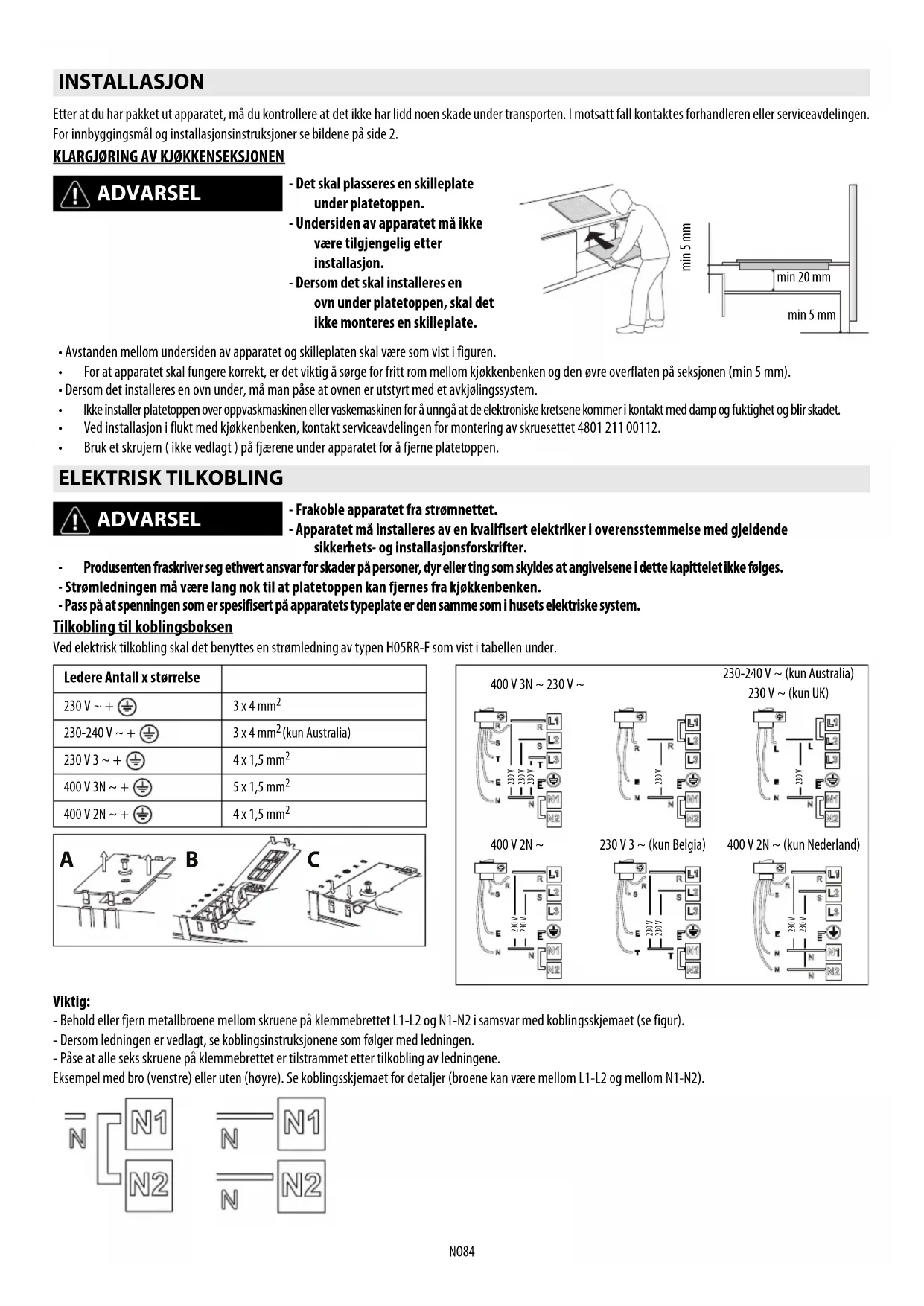 • For at apparatet skal fungere korrekt, er det viktig å sørge for fritt rom mellom kjøkkenbenken og den øvre overflaten på seksjonen (min 5 mm).