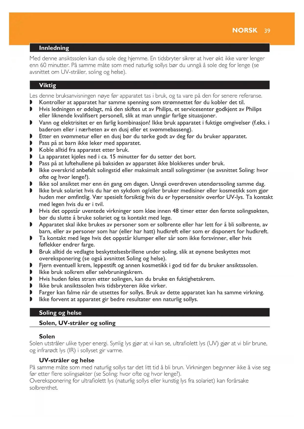 Apparatet skal ikke brukes av personer som er solbrente eller har lett for å bli solbrente, av