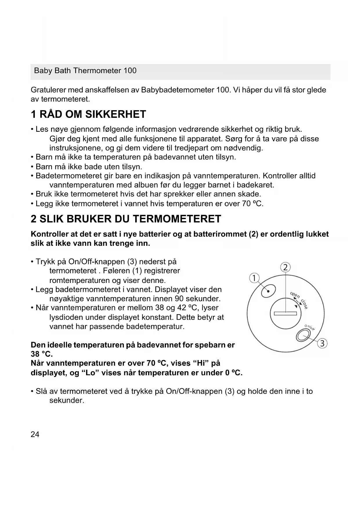 - Badetermometeret må bare åpnes når batterier skal skiftes.