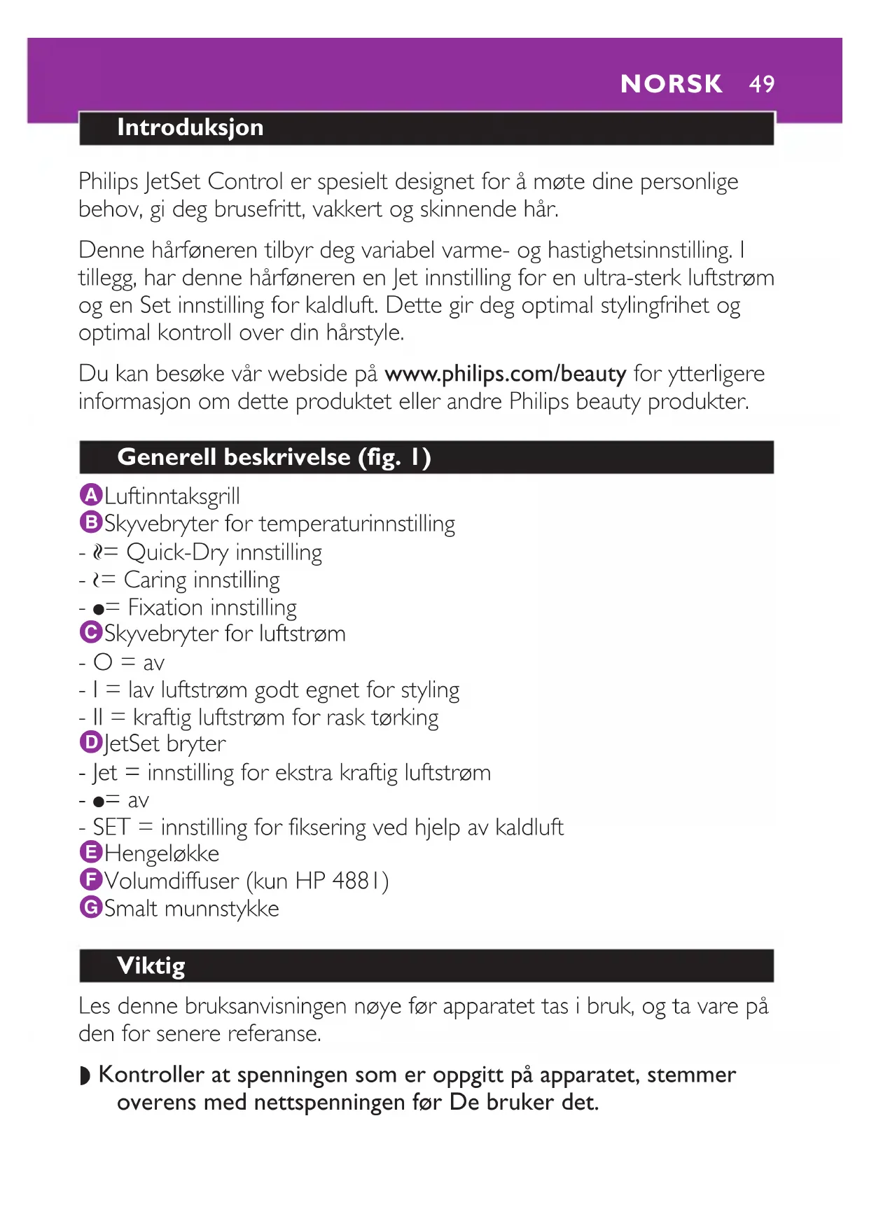 Last ned instruksjonene for din Hårføner i PDF-format gratis! Finn veiledningen din JetSet Control HP4880 - PHILIPS og ta den elektroniske enheten tilbake i hendene. På denne siden er alle dokumenter som er nødvendige for bruken av enheten din publisert. JetSet Control HP4880 av merket PHILIPS.