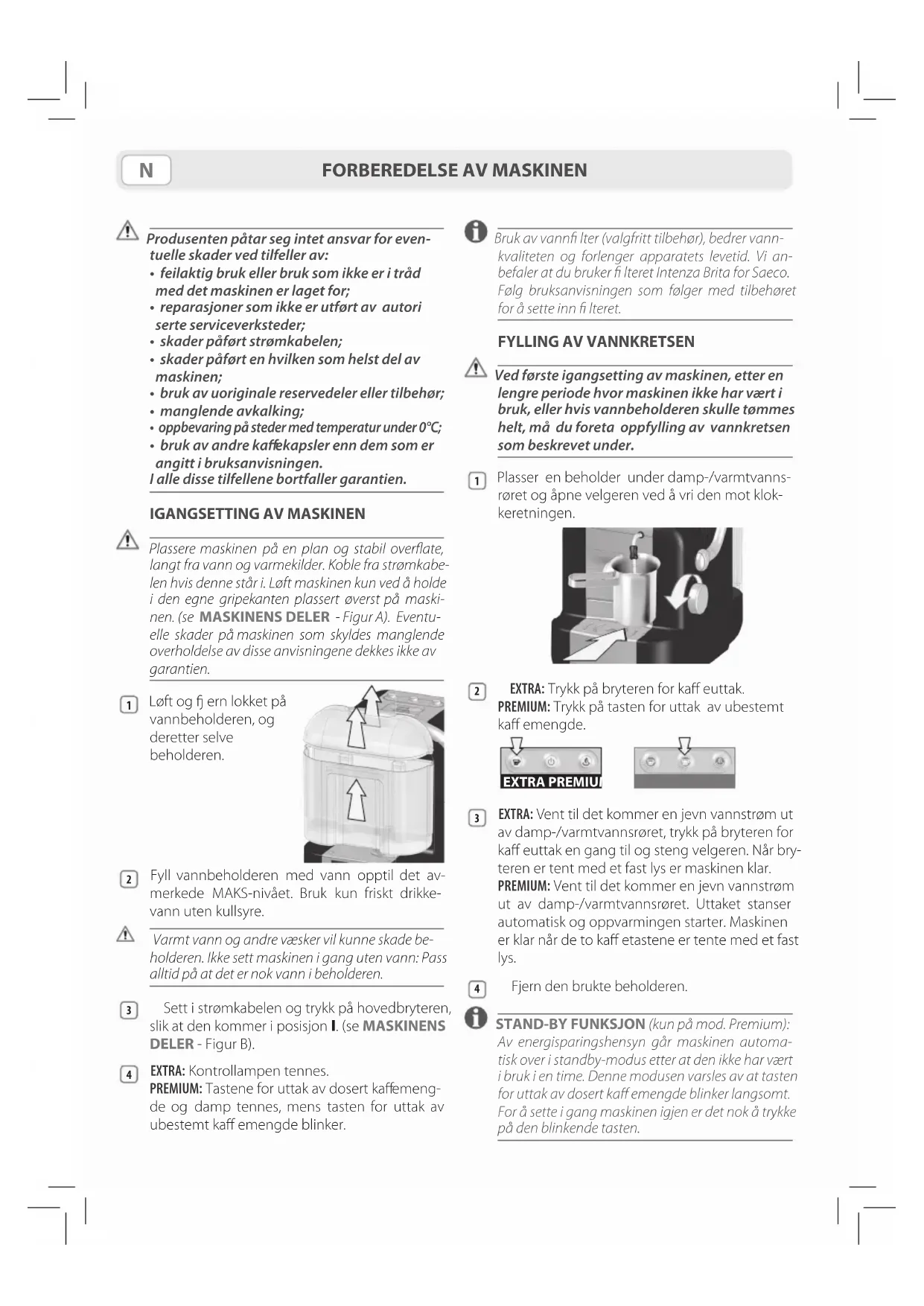 skadet. Kun autoriserte Saeco-serviceverksteder kan foreta inngrep og reparasjoner. Produsenten fraskriver seg ethvert ansvar