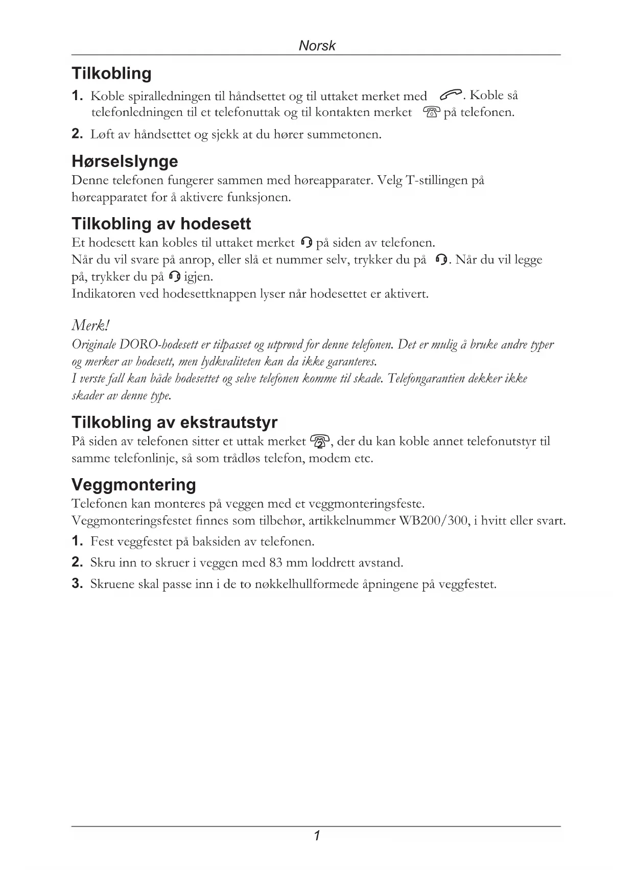igjen. Indikatoren ved hodesettknappen lyser når hodesettet er aktivert. Merk! Originale DORO-hodesett er tilpasset og utprøvd for denne telefonen. Det er mulig å bruke andre typer og merker av hodesett, men lydkvaliteten kan da ikke garanteres. I verste fall kan både hodesettet og selve telefonen komme til skade. Telefongarantien dekker ikke skader av denne type. Tilkobling av ekstrautstyr På siden av telefonen sitter et uttak merket 8, der du kan koble annet telefonutstyr til samme telefonlinje, så som trådløs telefon, modem etc. Veggmontering Telefonen kan monteres på veggen med et veggmonteringsfeste. Veggmonteringsfestet nnes som tilbehør, artikkelnummer WB200/300, i hvitt eller svart.