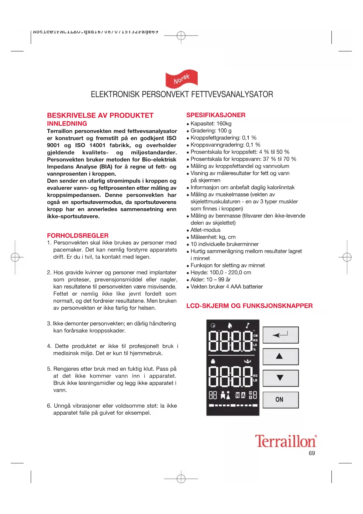 BESKRIVELSE AV PRODUKTET INNLEDNING Terraillon personvekten med fettvevsanalysatorer konstruert og fremstilt på en godkjent ISO9001 og ISO 14001 fabrikk, og overholder gjeldende kvalitets- og miljøstandarder.Personvekten bruker metoden for Bio-elektriskImpedans Analyse (BIA) for å regne ut fett- ogvannprosenten i kroppen. Den sender en ufarlig strømimpuls i kroppen ogevaluerer vann- og fettprosenten etter måling avkroppsimpedansen. Denne personvekten harogså en sportsutøvermodus, da sportsutøverenskropp har en annerledes sammensetning ennikke-sportsutøvere. FORHOLDSREGLER 1. Personvekten skal ikke brukes av personer medpacemaker. Det kan nemlig forstyrre apparatetsdrift. Er du i tvil, ta kontakt med legen.2. Hos gravide kvinner og personer med implantatersom proteser, prevensjonsmiddel eller nagler,kan resultatene til personvekten være misvisende.Fettet er nemlig ikke like jevnt fordelt som normalt, og det fordreier resultatene. Men brukenav personvekten er ikke farlig for helsen.3. Ikke demonter personvekten; en dårlig håndteringkan forårsake kroppsskader.4. Dette produktet er ikke til profesjonelt bruk imedisinsk miljø. Det er kun til hjemmebruk.5. Rengjøres etter bruk med en fuktig klut. Pass påat det ikke kommer vann inn i apparatet. Bruk ikke løsningsmidler og legg ikke apparatet ivann.6. Unngå vibrasjoner eller voldsomme støt: la ikkeapparatet falle på gulvet for eksempel. SPESIFIKASJONER