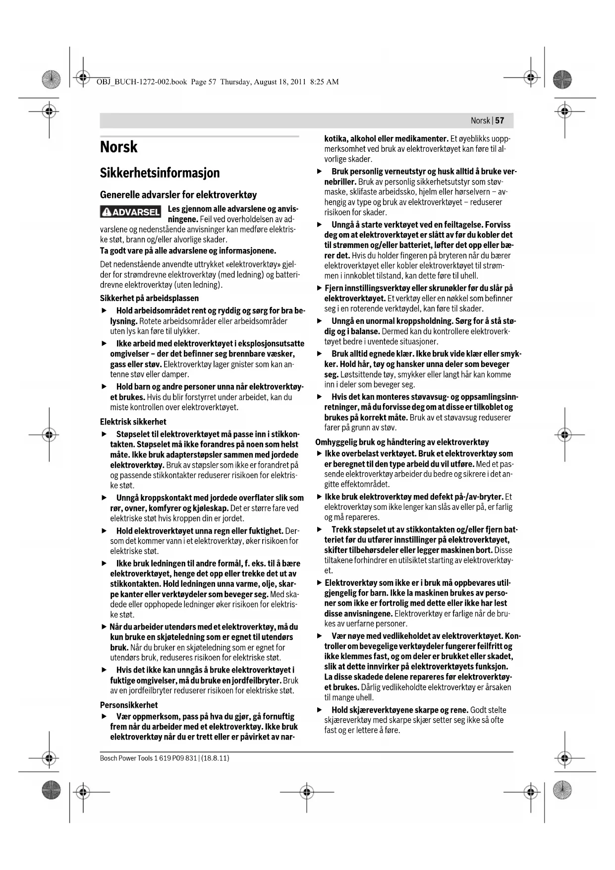 OBJ_BUCH-1272-002.book Page 56 Thursday, August 18, 2011 8:25 AMNorsk | 57 Bosch Power Tools 1 619 P09 831 | (18.8.11) Norsk