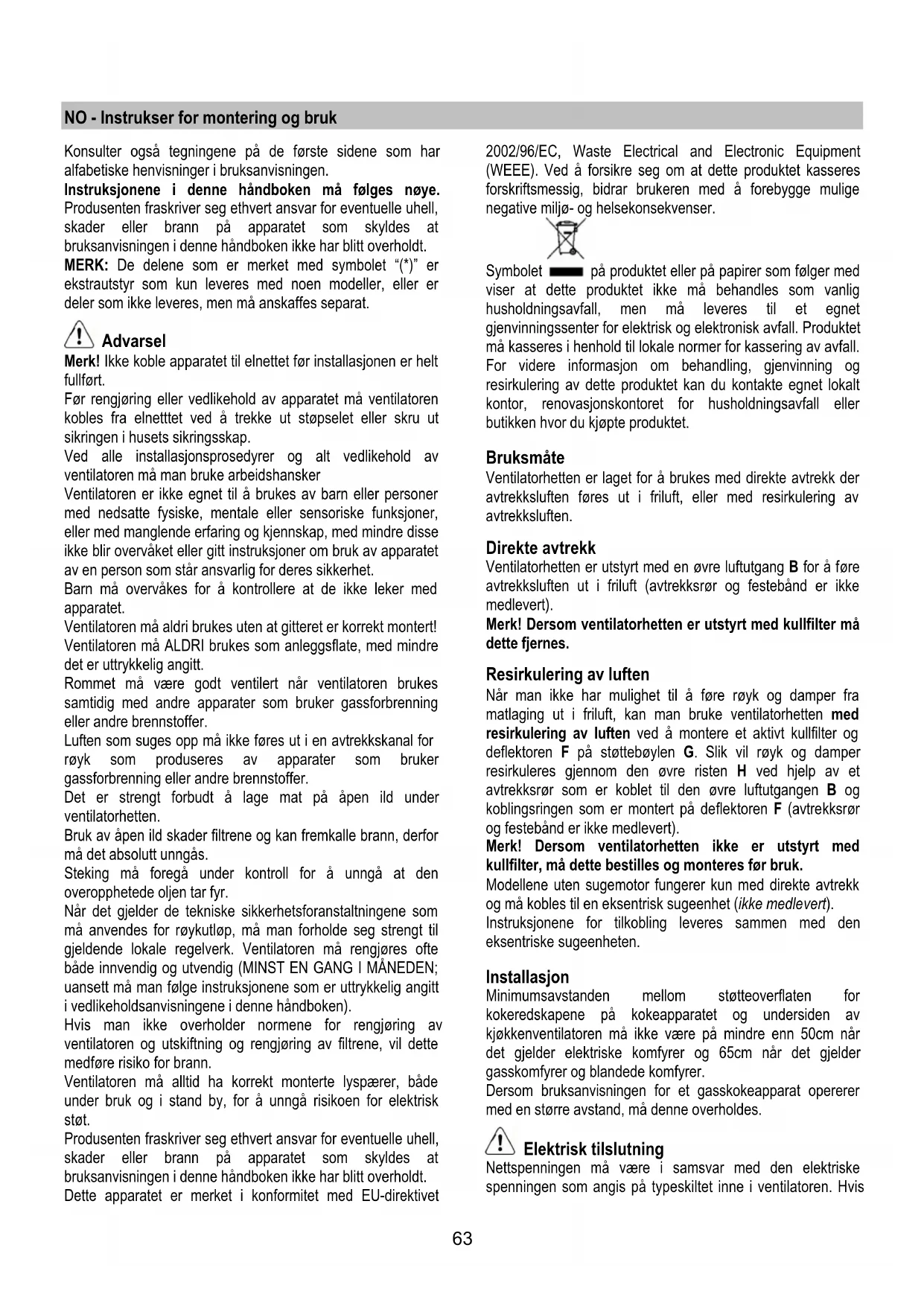 Merk! Ikke koble apparatet til elnettet før installasjonen er helt