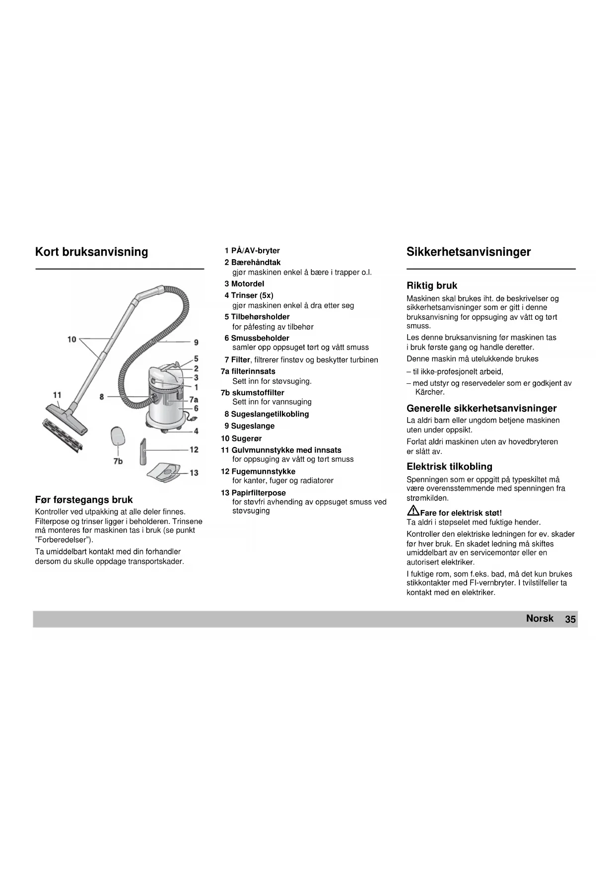 Eksplosjonsfare! Sug aldri opp og sprøyt aldri ut eksplosive væsker, brennbare gasser, eksplosivt støv, samt ufortynnede syrer og løsemidler! Til dette hører bensin, tynner og fyringsolje, som blandet med innsugningsluft kan danne eksplosive damper og blandinger. Detter gjelder også Aceton, ufortynnede syrer og løsemidler, aluminiums- og magnesiumstøv. I tillegg kan disse stoffene angripe materialene som maskinen er laget av.Sug aldri opp brennende eller glødende gjenstander.Ved bruk av maskinen på farlige steder (f.eks. bensinstasjoner etc.), må det tas hensyn til gjeldende sikkerhetsforskrifter. Maskinen må ikke brukes på eksplosjonsfarlige steder. Miljøvern Avhending av emballasjeEmballasjemateriellet er gjenvinnbart. Vennligst levert emballasjen på et dertil egnet oppsamlingssted for gjenbruk.Avhending av gamle maskinerInformasjon vedr. miljøriktig avhending får du ved å ta kontakt med din Kärcher-forhandler. Betjening