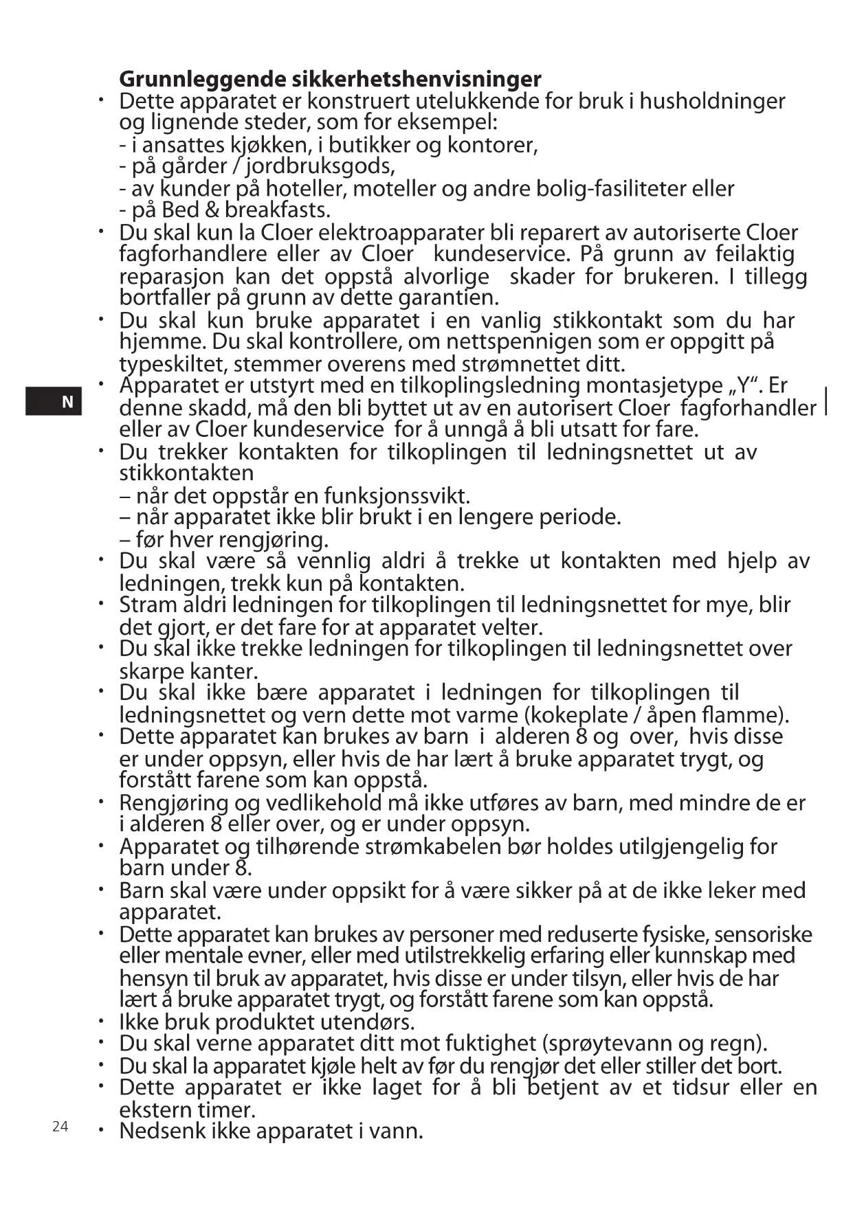 FI24 Grunnleggende sikkerhetshenvisninger Dette apparatet er konstruert utelukkende for bruk i husholdninger og lignende steder, som for eksempel: - i ansattes kjøkken, i butikker og kontorer, - på gårder / jordbruksgods, - av kunder på hoteller, moteller og andre bolig-fasiliteter eller - på Bed & breakfasts. Du skal kun la Cloer elektroapparater bli reparert av autoriserte Cloer fagforhandlere eller av Cloer kundeservice. På grunn av feilaktig reparasjon kan det oppstå alvorlige skader for brukeren. I tillegg bortfaller på grunn av dette garantien. Du skal kun bruke apparatet i en vanlig stikkontakt som du har hjemme. Du skal kontrollere, om nettspennigen som er oppgitt på typeskiltet, stemmer overens med strømnettet ditt. Apparatet er utstyrt med en tilkoplingsledning montasjetype „Y“. Er denne skadd, må den bli byttet ut av en autorisert Cloer fagforhandler eller av Cloer kundeservice for å unngå å bli utsatt for fare. Du trekker kontakten for tilkoplingen til ledningsnettet ut av stikkontakten – når det oppstår en funksjonssvikt. – når apparatet ikke blir brukt i en lengere periode. – før hver rengjøring. Du skal være så vennlig aldri å trekke ut kontakten med hjelp av ledningen, trekk kun på kontakten. Stram aldri ledningen for tilkoplingen til ledningsnettet for mye, blir det gjort, er det fare for at apparatet velter. Du skal ikke trekke ledningen for tilkoplingen til ledningsnettet over skarpe kanter. Du skal ikke bære apparatet i ledningen for tilkoplingen til ledningsnettet og vern dette mot varme (kokeplate / åpen amme). Dette apparatet kan brukes av barn i alderen 8 og over, hvis disse er under oppsyn, eller hvis de har lært å bruke apparatet trygt, og forstått farene som kan oppstå. Rengjøring og vedlikehold må ikke utføres av barn, med mindre de er i alderen 8 eller over, og er under oppsyn. Apparatet og tilhørende strømkabelen bør holdes utilgjengelig for barn under 8. Barn skal være under oppsikt for å være sikker på at de ikke leker med apparatet. Dette apparatet kan brukes av personer med reduserte fysiske, sensoriske eller mentale evner, eller med utilstrekkelig erfaring eller kunnskap med hensyn til bruk av apparatet, hvis disse er under tilsyn, eller hvis de har lært å bruke apparatet trygt, og forstått farene som kan oppstå. Ikke bruk produktet utendørs. Du skal verne apparatet ditt mot fuktighet (sprøytevann og regn). Du skal la apparatet kjøle helt av før du rengjør det eller stiller det bort. Dette apparatet er ikke laget for å bli betjent av et tidsur eller en ekstern timer. Nedsenk ikke apparatet i vann.