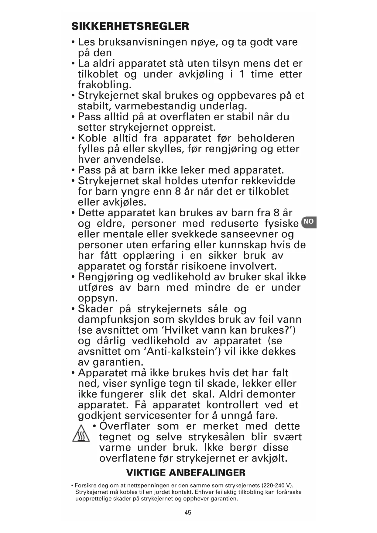 • Apparatet gir fra seg damp som kan forårsake forbrenning, især ved stryking på kanten