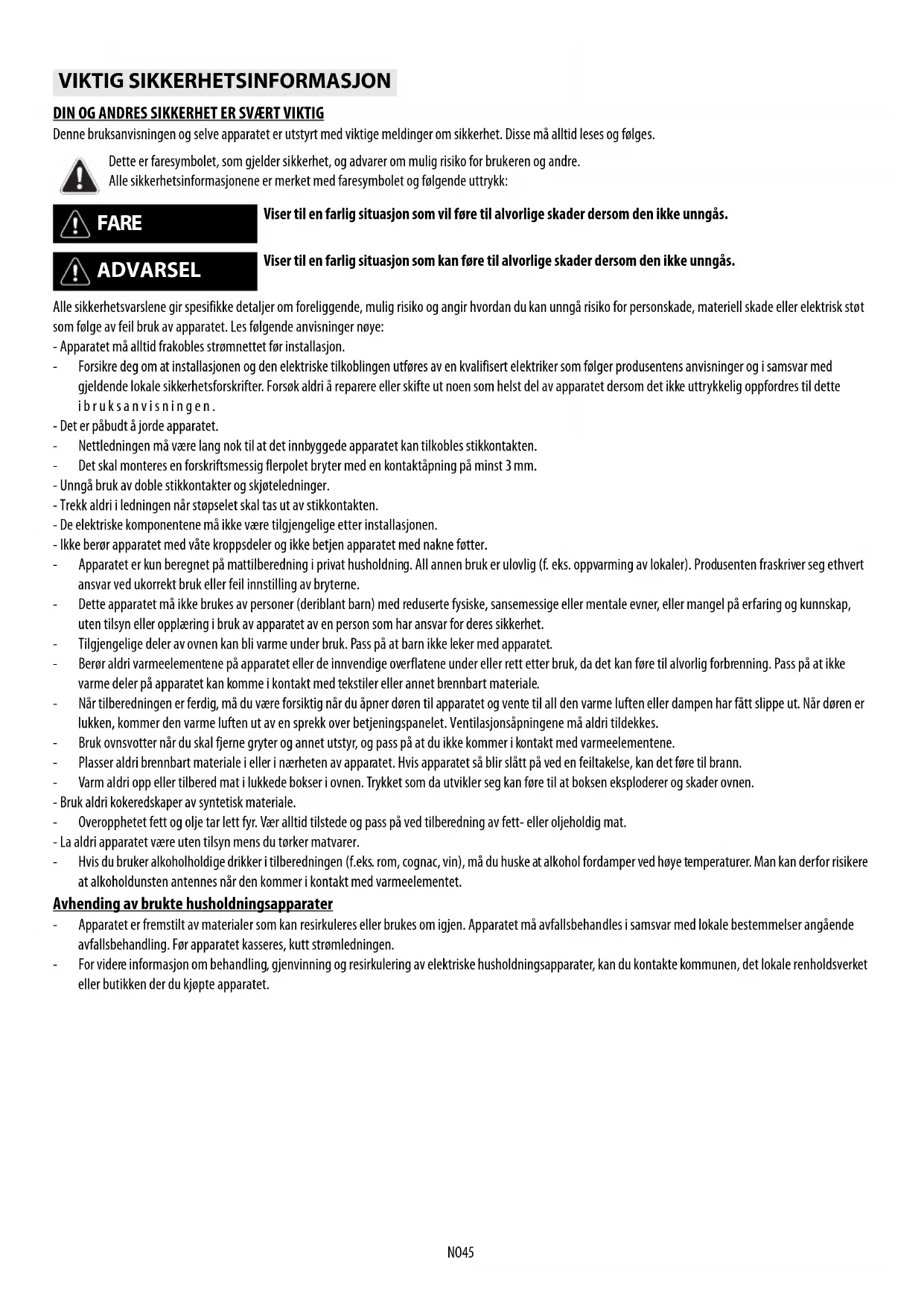 - Apparatet er kun beregnet på mattilberedning i privat husholdning. All annen bruk er ulovlig (f. eks. oppvarming av lokaler). Produsenten fraskriver seg ethvert