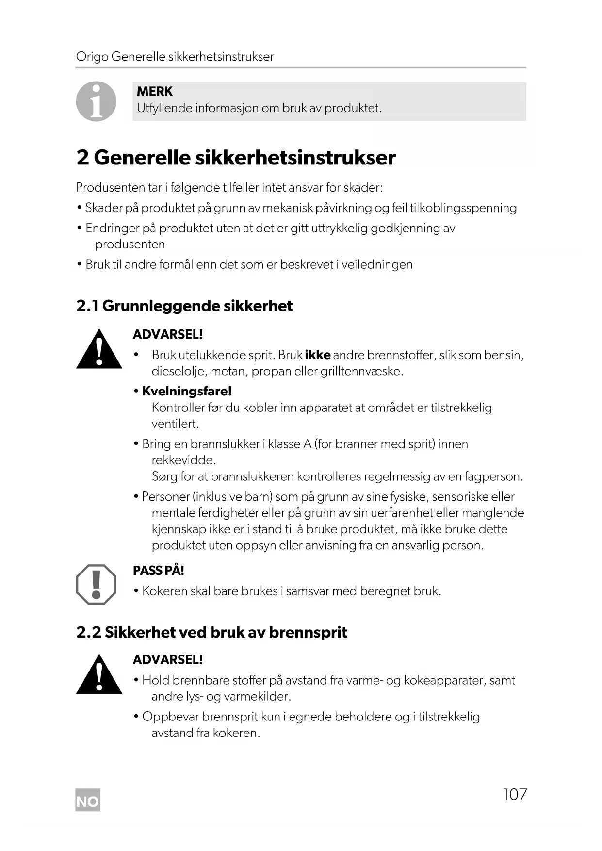 Origo-A100-A200--O-16s.book Seite 107 Freitag, 18. Mai 2018 10:40 10NO Generelle sikkerhetsinstrukser Origo