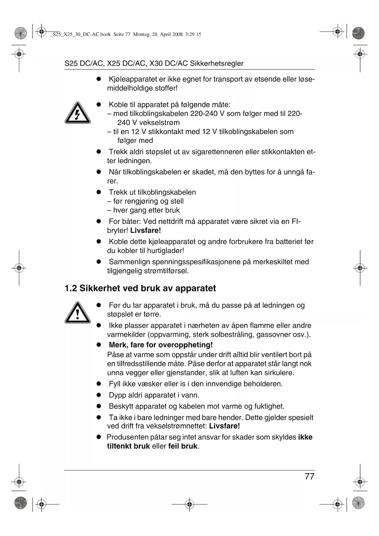 z Apparatet må ikke tas i bruk hvis det har synlige skader. z Pass på at lufteåpningene ikke blir blokkert. z Reparasjoner på dette apparatet må kun utføres av fagfolk. Feil reparasjoner kan føre til betydelige skader. z Ikke bruk elektriske apparater inne i kjøleboksen, hvis ikke disse apparatene er anbefalt brukt av produsenten. z Personer (inklusive barn) som på grunn av sine fysiske, sensoriske eller mentale ferdigheter eller på grunn av sin uerfarenhet eller manglende kjennskap ikke er i stand til å bruke kjøleboksen på en sikker måte, må ikke bruke dette apparatet uten oppsyn eller anvisning fra en ansvarlig person. z Elektriske apparater er ikke beregnet for barn! Oppbevar og bruk apparatet utenfor barns rekkevidde. z Barn skal være under tilsyn for å sikre at de ikke leker med apparatet. z Næringsmidler må oppbevares i originalforpakning eller i egne- de beholdere. _S25_X25_30_DC-AC.book Seite 76 Montag, 28. April 2008 3:29 15S25 DC/AC, X25 DC/AC, X30 DC/AC Sikkerhetsregler