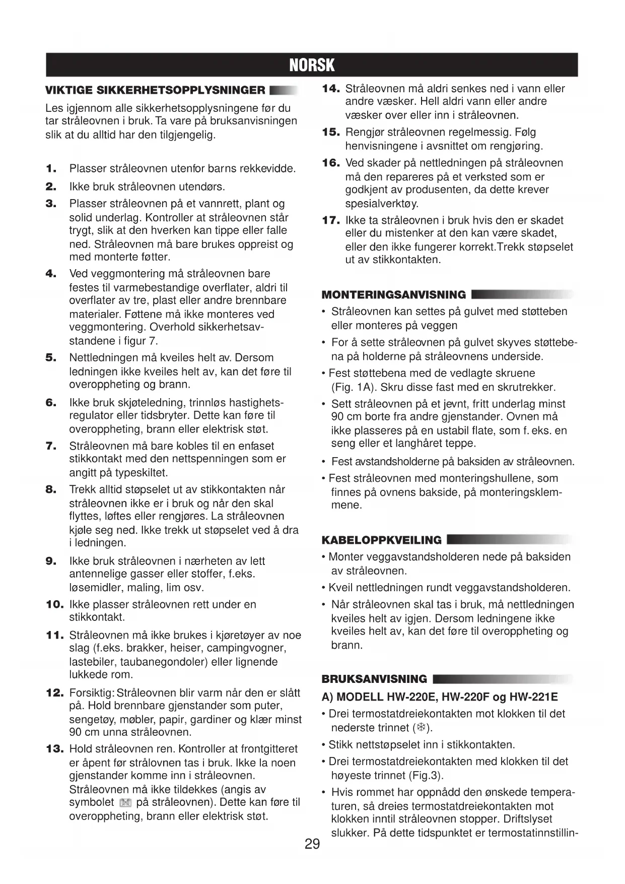 - Når stråleovnen skal tas i bruk, må nettledningen kveiles helt av igjen. Dersom ledningene ikke kveiles helt av, kan det føre til overoppheting og brann. BRUKSANVISNING A) MODELL HW-220E, HW-220F og HW-221E