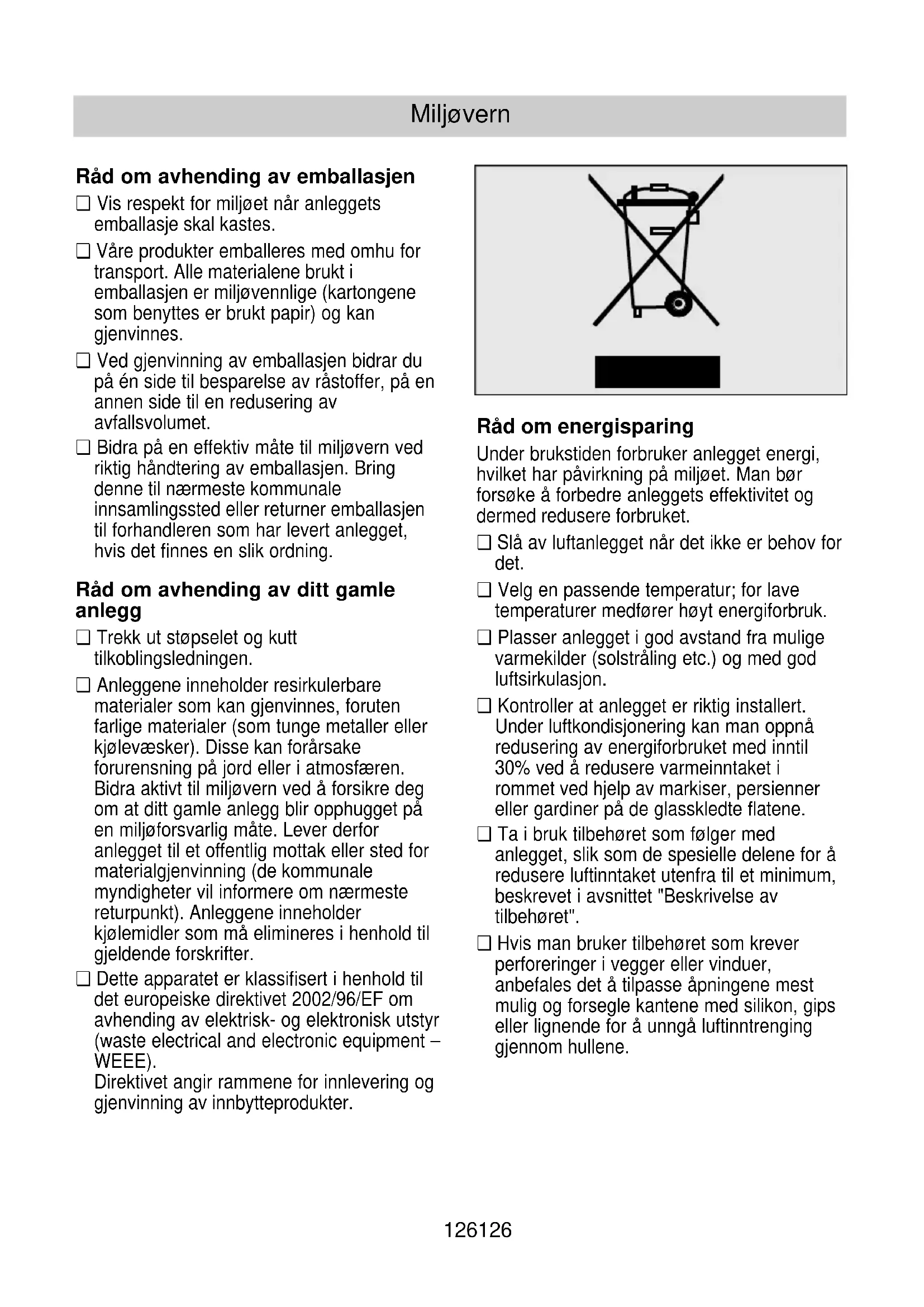 Miljøvern Råd om avhending av emballasjen ❏ Vis respekt for miljøet når anleggets emballasje skal kastes. ❏ Våre produkter emballeres med omhu for transport. Alle materialene brukt i emballasjen er miljøvennlige (kartongene som benyttes er brukt papir) og kan gjenvinnes. ❏ Ved gjenvinning av emballasjen bidrar du på én side til besparelse av råstoffer, på en annen side til en redusering av avfallsvolumet. ❏ Bidra på en effektiv måte til miljøvern ved riktig håndtering av emballasjen. Bring denne til nærmeste kommunale innsamlingssted eller returner emballasjen til forhandleren som har levert anlegget, hvis det finnes en slik ordning. Råd om avhending av ditt gamle anlegg ❏ Trekk ut støpselet og kutt tilkoblingsledningen. ❏ Anleggene inneholder resirkulerbare materialer som kan gjenvinnes, foruten farlige materialer (som tunge metaller eller kjølevæsker). Disse kan forårsake forurensning på jord eller i atmosfæren. Bidra aktivt til miljøvern ved å forsikre deg om at ditt gamle anlegg blir opphugget på en miljøforsvarlig måte. Lever derfor anlegget til et offentlig mottak eller sted for materialgjenvinning (de kommunale myndigheter vil informere om nærmeste returpunkt). Anleggene inneholder kjølemidler som må elimineres i henhold til gjeldende forskrifter. ❏ Dette apparatet er klassifisert i henhold til det europeiske direktivet 2002/96/EF om avhending av elektrisk- og elektronisk utstyr (waste electrical and electronic equipment – WEEE). Direktivet angir rammene for innlevering og gjenvinning av innbytteprodukter. Råd om energisparing Under brukstiden forbruker anlegget energi, hvilket har påvirkning på miljøet. Man bør forsøke å forbedre anleggets effektivitet og dermed redusere forbruket. ❏ Slå av luftanlegget når det ikke er behov for det. ❏ Velg en passende temperatur; for lave temperaturer medfører høyt energiforbruk. ❏ Plasser anlegget i god avstand fra mulige varmekilder (solstråling etc.) og med god luftsirkulasjon. ❏ Kontroller at anlegget er riktig installert. Under luftkondisjonering kan man oppnå redusering av energiforbruket med inntil 30% ved å redusere varmeinntaket i rommet ved hjelp av markiser, persienner eller gardiner på de glasskledte flatene. ❏ Ta i bruk tilbehøret som følger med anlegget, slik som de spesielle delene for å redusere luftinntaket utenfra til et minimum, beskrevet i avsnittet "Beskrivelse av tilbehøret". ❏ Hvis man bruker tilbehøret som krever perforeringer i vegger eller vinduer, anbefales det å tilpasse åpningene mest mulig og forsegle kantene med silikon, gips eller lignende for å unngå luftinntrenging gjennom hullene.Viktig informasjon