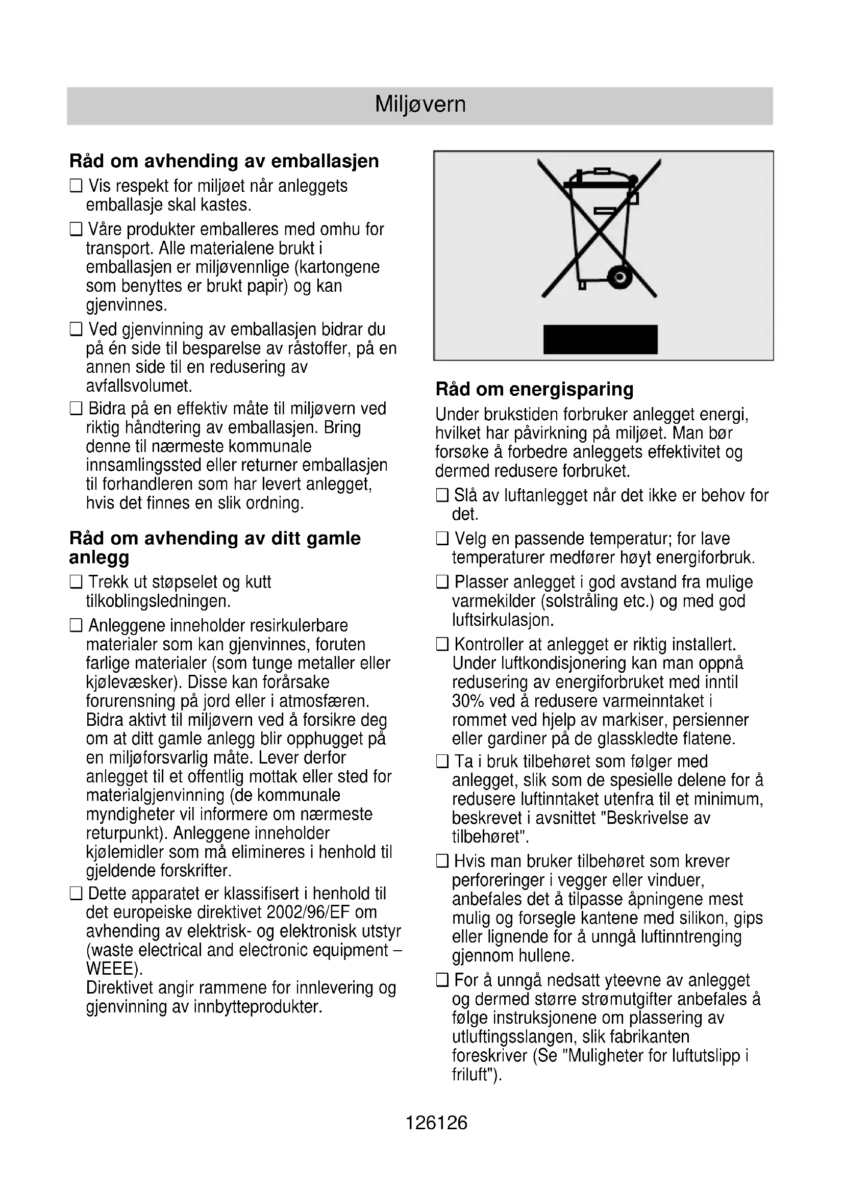 Miljøvern Råd om avhending av emballasjen ❏ Vis respekt for miljøet når anleggets emballasje skal kastes. ❏ Våre produkter emballeres med omhu for transport. Alle materialene brukt i emballasjen er miljøvennlige (kartongene som benyttes er brukt papir) og kan gjenvinnes. ❏ Ved gjenvinning av emballasjen bidrar du på én side til besparelse av råstoffer, på en annen side til en redusering av avfallsvolumet. ❏ Bidra på en effektiv måte til miljøvern ved riktig håndtering av emballasjen. Bring denne til nærmeste kommunale innsamlingssted eller returner emballasjen til forhandleren som har levert anlegget, hvis det finnes en slik ordning. Råd om avhending av ditt gamle anlegg ❏ Trekk ut støpselet og kutt tilkoblingsledningen. ❏ Anleggene inneholder resirkulerbare materialer som kan gjenvinnes, foruten farlige materialer (som tunge metaller eller kjølevæsker). Disse kan forårsake forurensning på jord eller i atmosfæren. Bidra aktivt til miljøvern ved å forsikre deg om at ditt gamle anlegg blir opphugget på en miljøforsvarlig måte. Lever derfor anlegget til et offentlig mottak eller sted for materialgjenvinning (de kommunale myndigheter vil informere om nærmeste returpunkt). Anleggene inneholder kjølemidler som må elimineres i henhold til gjeldende forskrifter. ❏ Dette apparatet er klassifisert i henhold til det europeiske direktivet 2002/96/EF om avhending av elektrisk- og elektronisk utstyr (waste electrical and electronic equipment – WEEE). Direktivet angir rammene for innlevering og gjenvinning av innbytteprodukter. Råd om energisparing Under brukstiden forbruker anlegget energi, hvilket har påvirkning på miljøet. Man bør forsøke å forbedre anleggets effektivitet og dermed redusere forbruket. ❏ Slå av luftanlegget når det ikke er behov for det. ❏ Velg en passende temperatur; for lave temperaturer medfører høyt energiforbruk. ❏ Plasser anlegget i god avstand fra mulige varmekilder (solstråling etc.) og med god luftsirkulasjon. ❏ Kontroller at anlegget er riktig installert. Under luftkondisjonering kan man oppnå redusering av energiforbruket med inntil 30% ved å redusere varmeinntaket i rommet ved hjelp av markiser, persienner eller gardiner på de glasskledte flatene. ❏ Ta i bruk tilbehøret som følger med anlegget, slik som de spesielle delene for å redusere luftinntaket utenfra til et minimum, beskrevet i avsnittet "Beskrivelse av tilbehøret". ❏ Hvis man bruker tilbehøret som krever perforeringer i vegger eller vinduer, anbefales det å tilpasse åpningene mest mulig og forsegle kantene med silikon, gips eller lignende for å unngå luftinntrenging gjennom hullene. ❏ For å unngå nedsatt yteevne av anlegget og dermed større strømutgifter anbefales å følge instruksjonene om plassering av utluftingsslangen, slik fabrikanten foreskriver (Se "Muligheter for luftutslipp i friluft").Viktig informasjon
