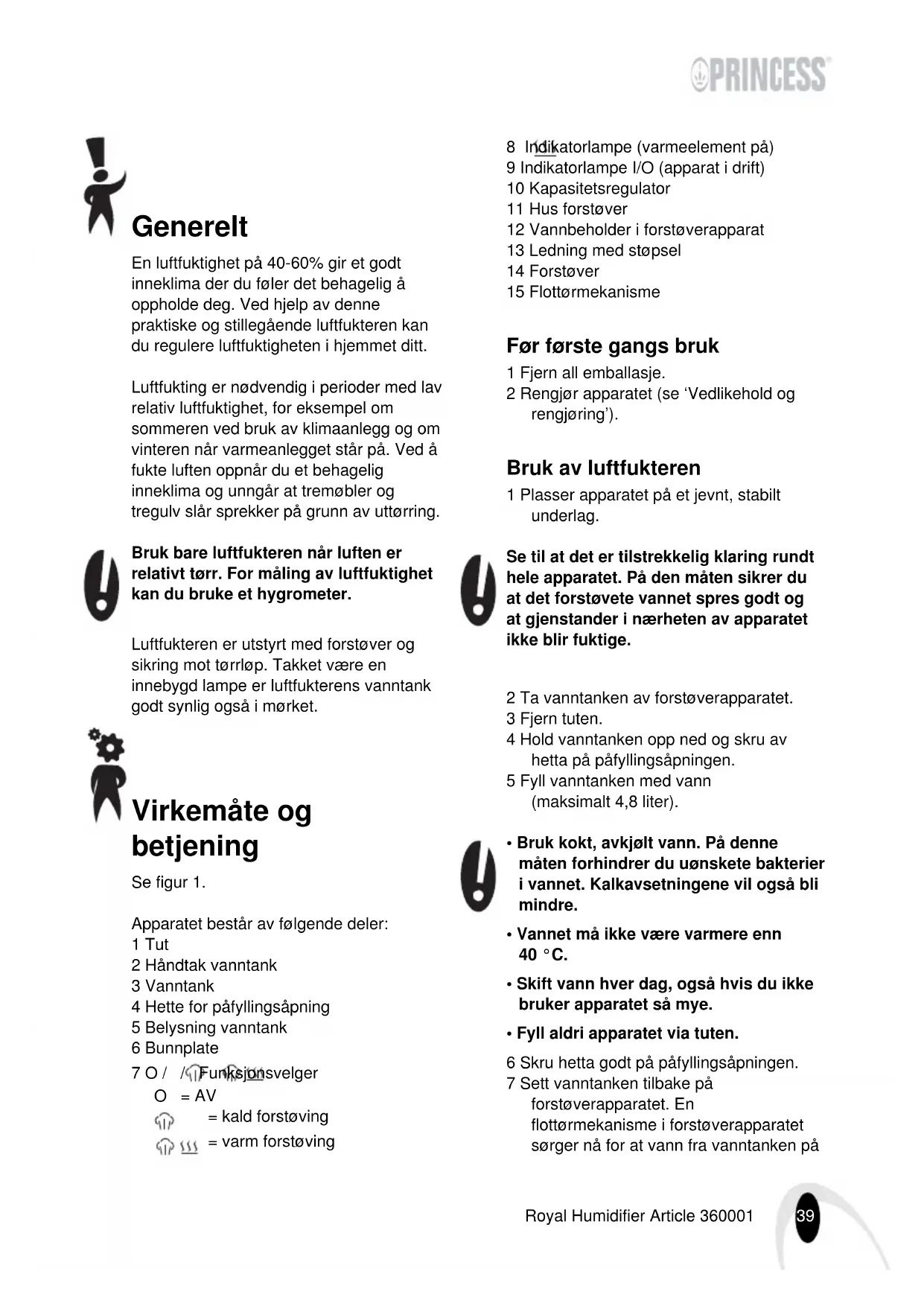 - 2002/96/EØF Princess_HL air_humidifier_360001.book Page 38 Thursday, August 23, 2007 11:35 AM39 Royal Humidifier Article 360001 Generelt En luftfuktighet på 40-60% gir et godt inneklima der du føler det behagelig å oppholde deg. Ved hjelp av denne praktiske og stillegående luftfukteren kan du regulere luftfuktigheten i hjemmet ditt. Luftfukting er nødvendig i perioder med lav relativ luftfuktighet, for eksempel om sommeren ved bruk av klimaanlegg og om vinteren når varmeanlegget står på. Ved å fukte luften oppnår du et behagelig inneklima og unngår at tremøbler og tregulv slår sprekker på grunn av uttørring. Bruk bare luftfukteren når luften er relativt tørr. For måling av luftfuktighet kan du bruke et hygrometer. Luftfukteren er utstyrt med forstøver og sikring mot tørrløp. Takket være en innebygd lampe er luftfukterens vanntank godt synlig også i mørket. Virkemåte og betjening Se figur 1. Apparatet består av følgende deler: 1 Tut 2 Håndtak vanntank 3 Vanntank 4 Hette for påfyllingsåpning 5 Belysning vanntank 6 Bunnplate 7 O / / Funksjonsvelger 8 Indikatorlampe (varmeelement på) 9 Indikatorlampe I/O (apparat i drift) 10 Kapasitetsregulator 11 Hus forstøver 12 Vannbeholder i forstøverapparat 13 Ledning med støpsel 14 Forstøver 15 Flottørmekanisme Før første gangs bruk 1 Fjern all emballasje. 2 Rengjør apparatet (se ‘Vedlikehold og rengjøring’). Bruk av luftfukteren 1 Plasser apparatet på et jevnt, stabilt underlag. Se til at det er tilstrekkelig klaring rundt hele apparatet. På den måten sikrer du at det forstøvete vannet spres godt og at gjenstander i nærheten av apparatet ikke blir fuktige. 2 Ta vanntanken av forstøverapparatet. 3 Fjern tuten. 4 Hold vanntanken opp ned og skru av hetta på påfyllingsåpningen. 5 Fyll vanntanken med vann (maksimalt 4,8 liter).